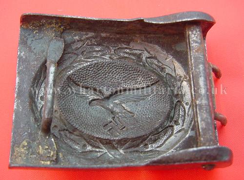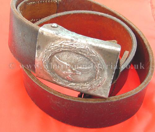 Luftwaffe belt and steel buckle in excellent condition retaining good crisp detail to buckle frontage. Buckle is unmarked. Belt is supple, maker marked 'Gebt.Mast, Dresden 1942'. The belt end has the signs of stitching, possibly an extension piece. A nice Luftwaffe issue belt and buckle.