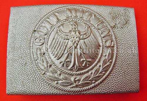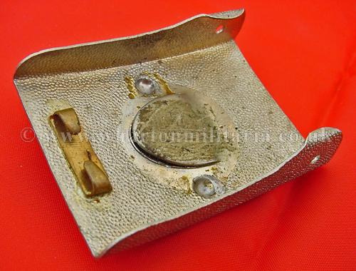 A between the wars Weimer Republic alloy belt buckle, buckle is crisp of detail with no wear at all, scarce slightly smaller 4 x 6 cm size, belt prongs have never been fitted, chances are it was never issued. A fairly scarce belt buckle in this condition, specimen example frontage. Local veteran bring back.