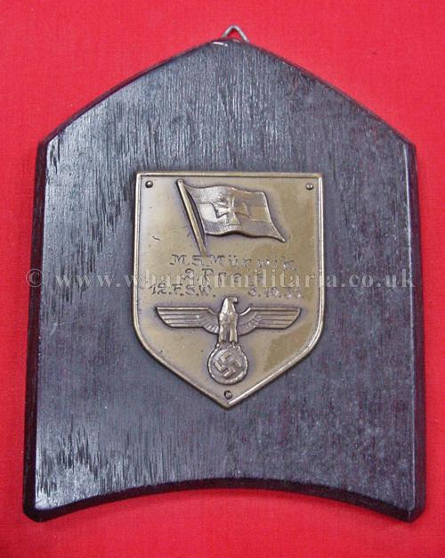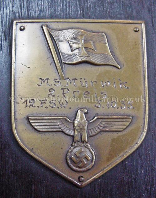 Third Reich period Kriegsmarine award plaque for sports, in excellent condition overall, nice patina, approx size is 4.25 x 5 inches / 11 x 13 cm, shows the Imperial Naval flag and the winner's details above a Third Reich eagle, a nice period sports plaque.