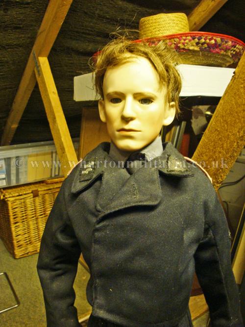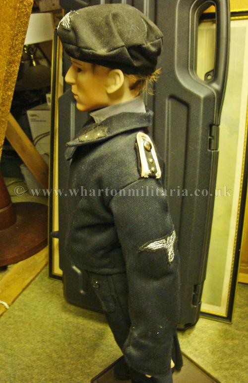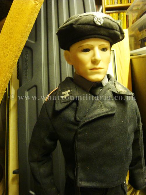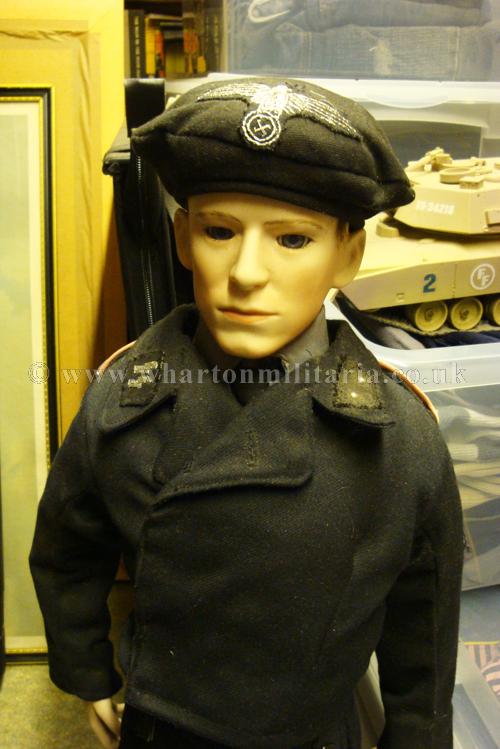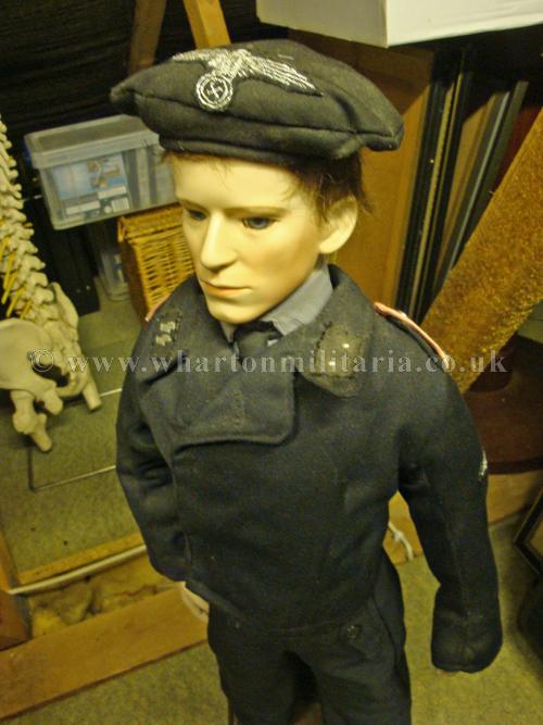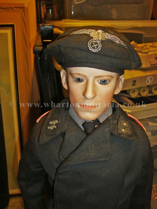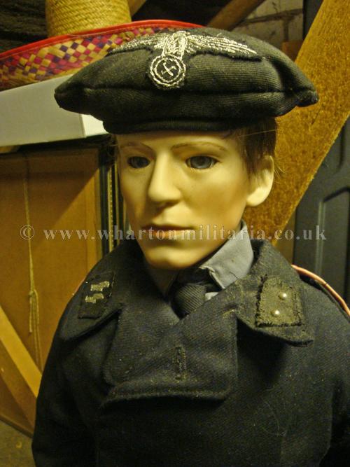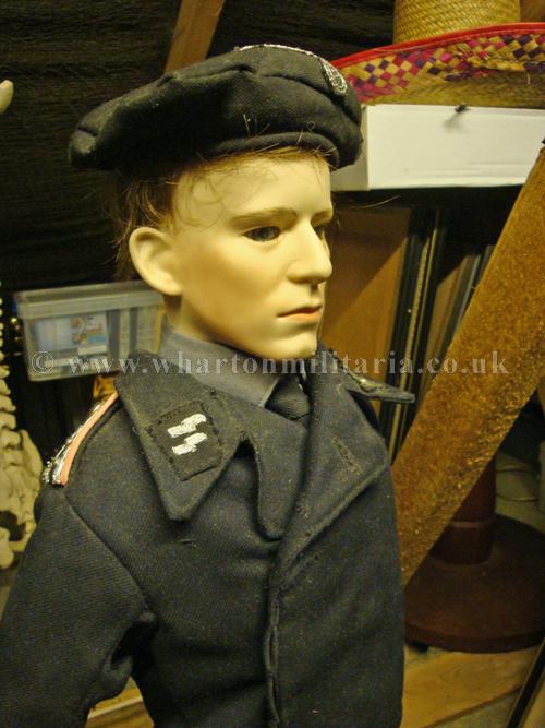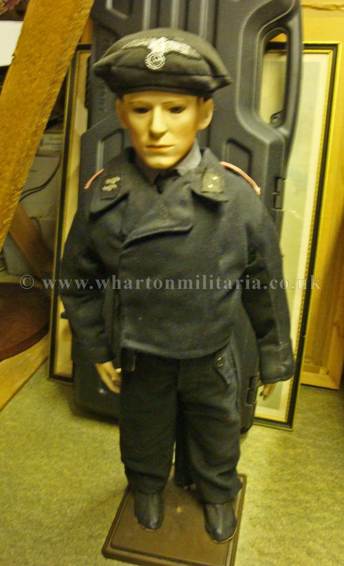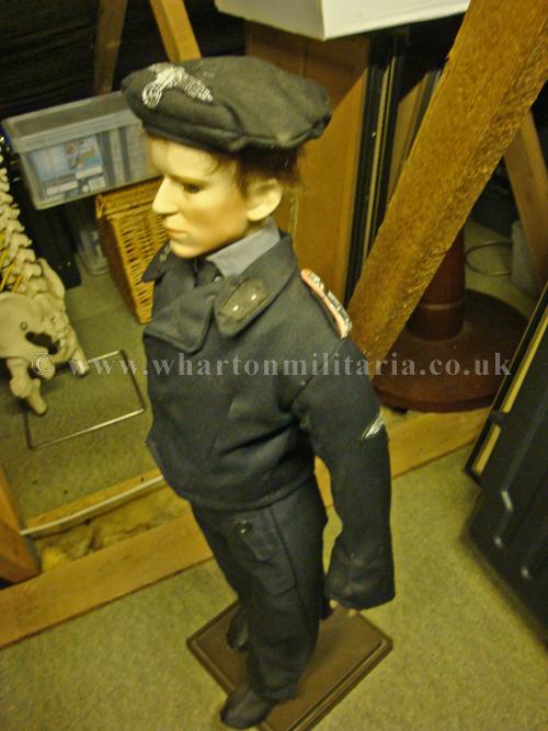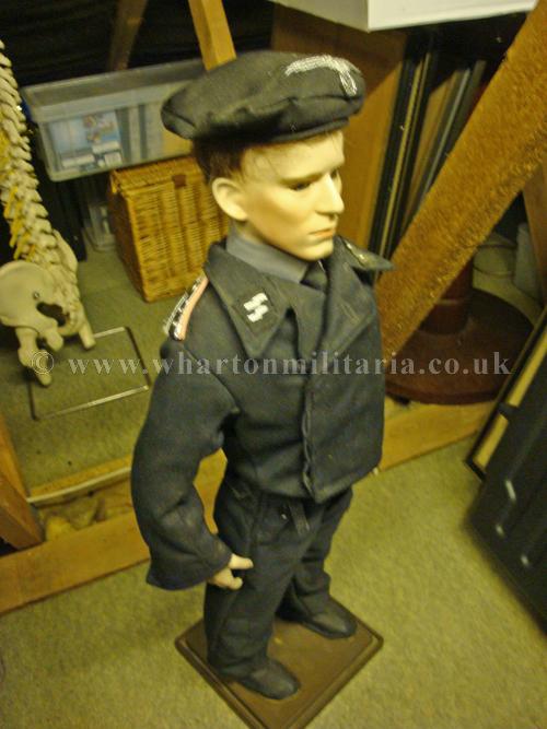 SS Panzer doll, a little something different, not come across one before, the figure is some 27 inches /68cm in height, painted ceramic hands and face, dressed in a panzerwrap and trousers, shirt, has boots and a beret, the insignia is handmade, a very unusual item, I have used a modern doll stand to hold the figure up. Very different and a little spooky but interesting.