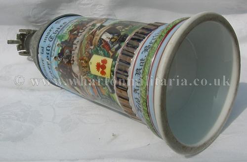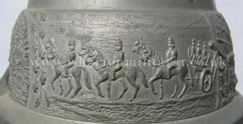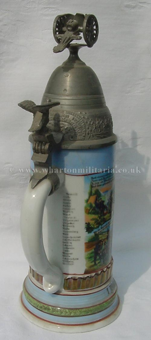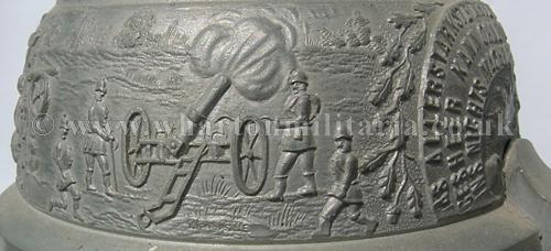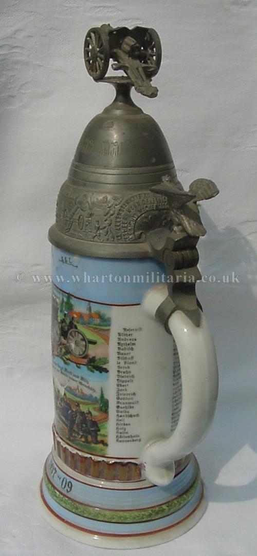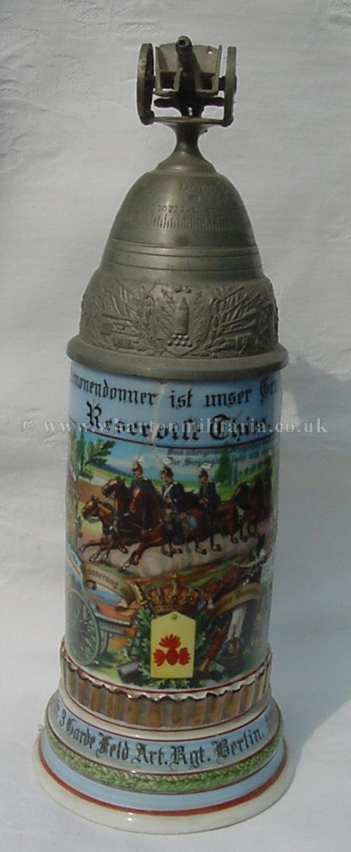 WW1 Veteran's commerative stein, shaped as per an artillery round head. Metal top/cap as round fuse with an artillery field gun to top and imperial eagle sat on handle top mechanism. Shown to '1 Battr. 3 Garde Feld Art. Regt. Berlin. 1907-09'. Images show an artillery horse team pulling the gun and carrying troops on the limber, the soldiers at rest around a fire, the gun team laying-on and a yellow shoulder board shape with the red artillery exploding grenade motif. An excellent piece but has had some repairs which is reflected in the price. Complete and quite rare.