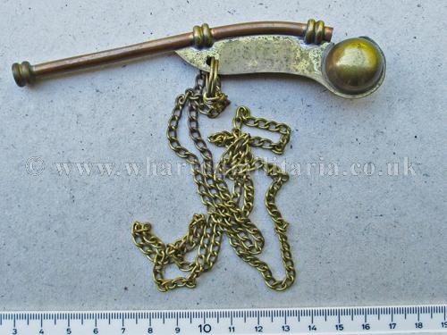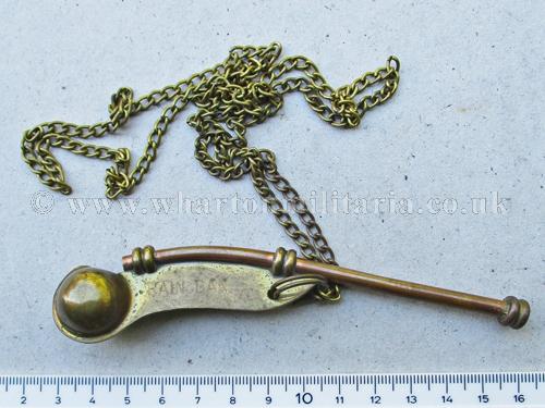 German Naval Bosun's Call or whistle by Stettin, in excellent condition complete with chain. I believe this is circ 1930s, the 'keel' is maker marked 'Stettin' on one side and 'Rain Dance' on the other. Nice naval whistle.