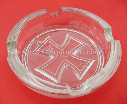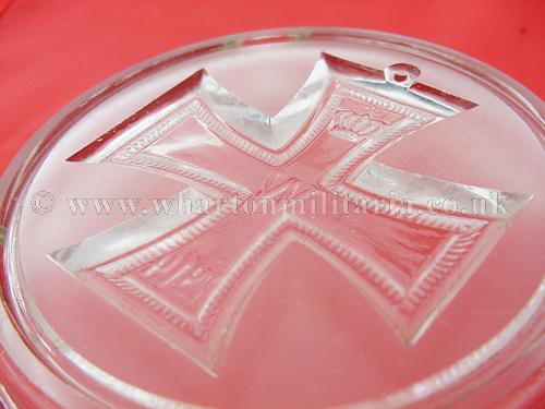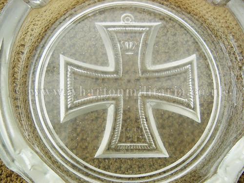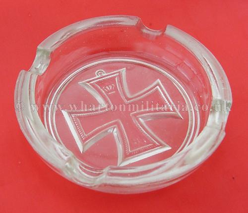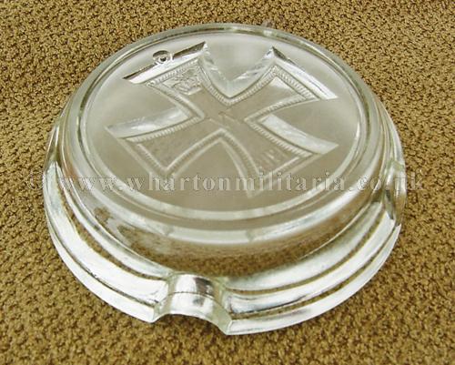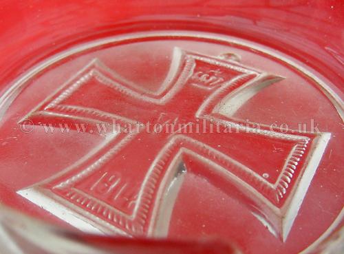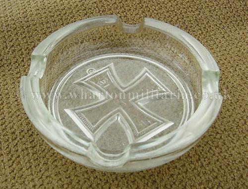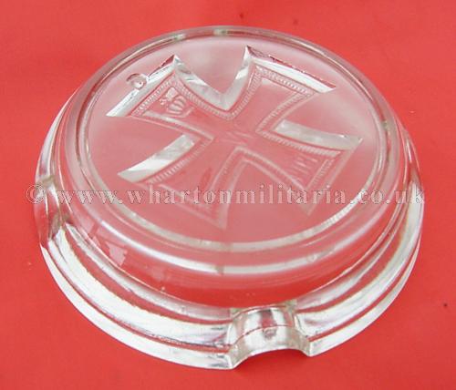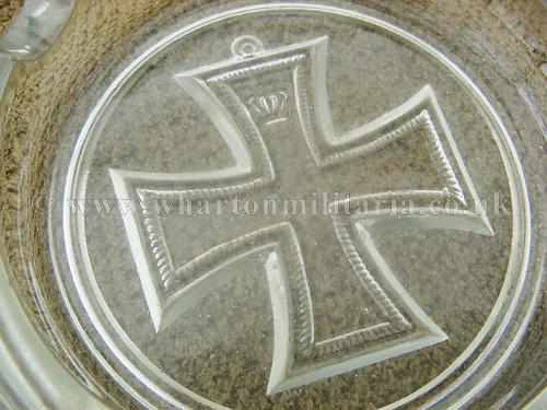 A fine WW1 German patriotic glass ashtray with the 1914 Iron Cross in the base, in excellent condition without cracks or damage, a heavy item, 110mm diameter. These patriotic pieces are becoming very scarce and desirable.