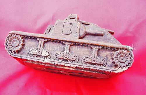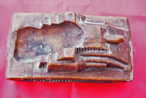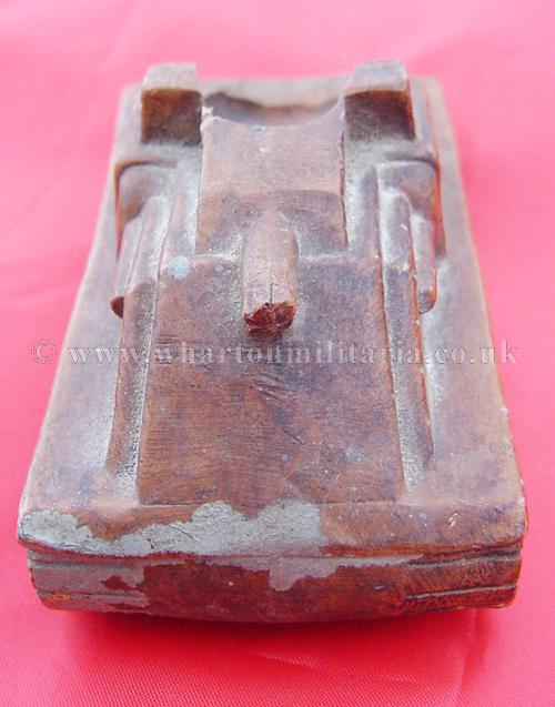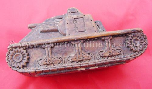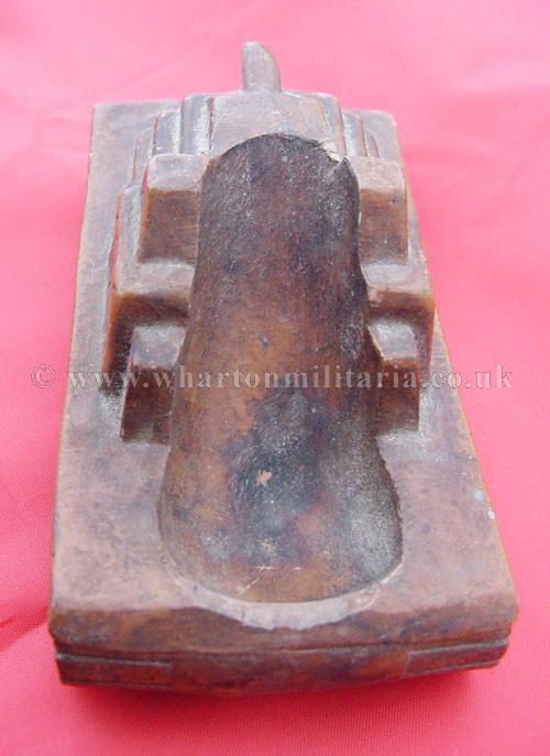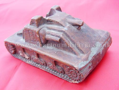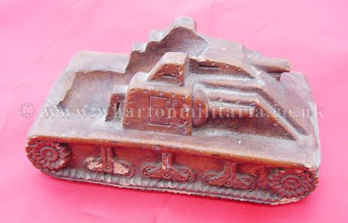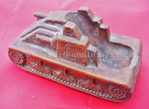 A scarce panzerman's pipe stand in the shape of an assault tank, tank is approximately 4 inches by 2 inches and 2 inches tall, made in a heavy resin, nicely detailed all around with the pipe 'well' in the rear of the tank body. A very nice personal item, not sure if it was a hand made or commercially made item, never seen another before. Something for the Panzer collector.