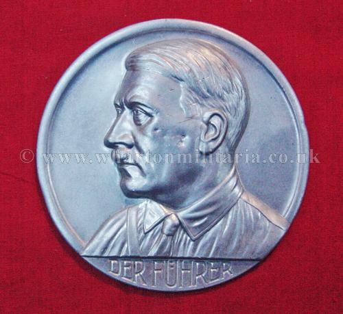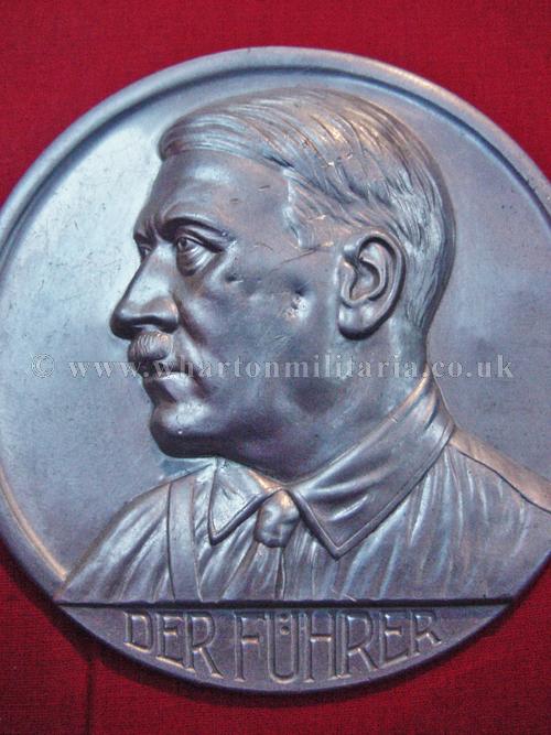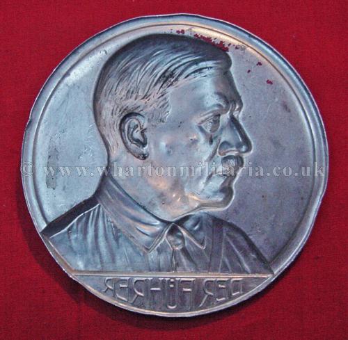 Adolf Hitler 'Der Fuhrer' plaque centre, an aluminium plaque with Hitler's image above 'Der Fuhrer' title pressed in, approx size is 10 cm diameter, possibly once fitted to a framed back, still a nice surviving iconic plaque of Hitler, could be put back into a period frame.