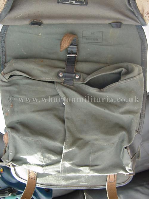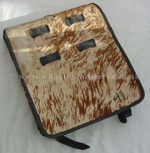 A pre-war cloth and leather SS Tornister fur covered back pack without carrying straps. This tornister frame is in excellent condition as is the pack overall, the flaps and cloth flaps are all clean, the fur cover is sparse though in good condition and does not smell. No bottom edge scuffing through wear and chaffing against belts which is a bonus. The tornister has an SS issue tag and unit stamp as well as the former owners details on the inside edge. The rear leather panel has the stamped runes. The pack is approx 13" x 12" x 2" inches in size. An excellent example of an early SS tornister in good condition