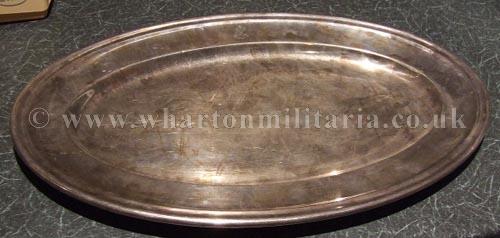 SS Leibstandarte Adolf Hitler Officers mess oval silver meat platter, has Leibstandarte LAH monogram on the top rim with eagle and swastika, makers details on the underside. Excellent quality mess ware from the premier SS Regt's Officers mess. Certificated Original, slightly smaller that above - pictures as per GE0031