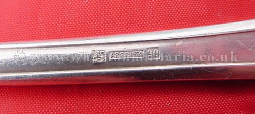 Luftwaffe Argenta 90 silver plate table fork, approx. 21cm in length, nicely stamped 'Fl.U.V.' with the eagle through the middle, dated 1935 under the Luftwaffe eagle and swastika, a heavy quality tableware marked with the Argenta brand along with the Lion and '90'. A very nice item of plate tableware.