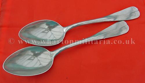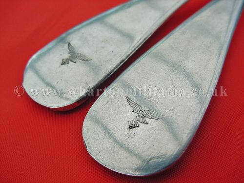 Two Luftwaffe aluminium table spoons, each approx. 21cm in length, stamped with the Luftwaffe eagle that faces left rather than right - associated with the Hermann Goring Division.