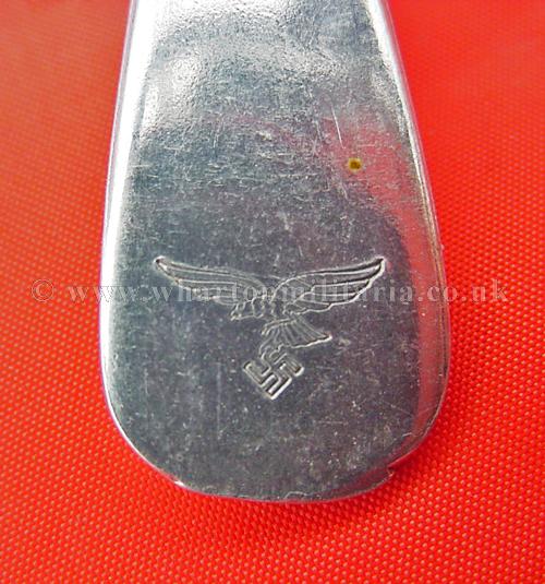 Luftwaffe aluminium tea spoon, approx. 14cm in length, stamped with the Luftwaffe eagle that faces left rather than right - associated with the Hermann Goring Division.