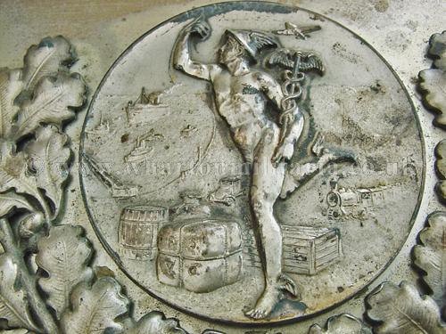 NSDAP Party presentation plaque to a Diplomat, Vienna 1940, in excellent condition, approx framed size is 36x32 cm, with the metal plague size being 24x20 cm, presented to a Franz Leibenfrost, plaque has what could be seen as a 'world commerce or logistical' theme. An interesting plaque, items to diplomatic personalities are not often seen.