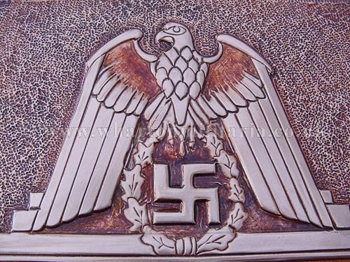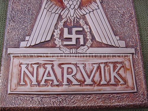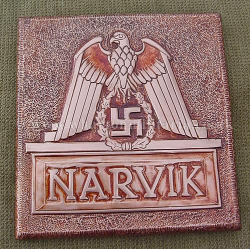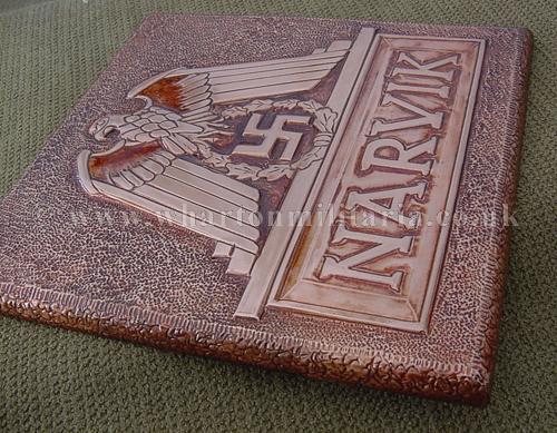 A very interesting, possibly contemporary or a POW made item, commemorating the battle of Narvik. Plaque is beaten sheet copper in a style very similar to WW1 trench art, approx 24x24cm in size, has the 'NARVIK' legend with the battle shield design German eagle above. The copper work is then backed on to a wooden plaque, again very German in execution, with a felt cover to the base. It does not appear to have ever had any fittings or hangers into the back. My personal thoughts are this is a POW or veteran piece, it is a very nice item and certainly of interest to a Kriegsmarine, Narvik or battle shield collector. Something a little different.