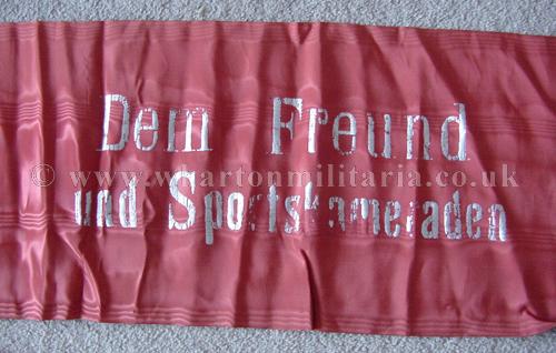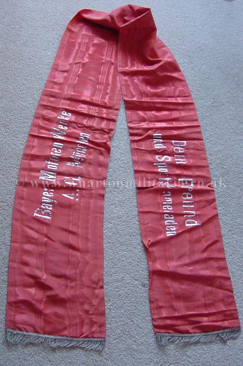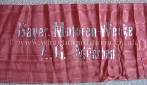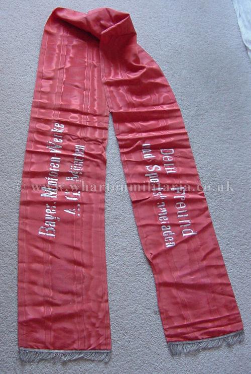 An interesting and scarce wartime BMW funeral drape or banner, very much in the funeral drape style, in excellent overall condition, lettering is in silver printed foil-paint 'Dem Freund und Sportskameraden - Bayer.Motoren-Werke A.G. Munchen' (A friend and sports comrade, BMW Works, Munchen), some fading and wear to the letters. A nice interesting item, approx size is 102x26 cm not counting the silver wire fringe at each end. This is an interesting funeral drape for a pre-war and wartime BMW team member.