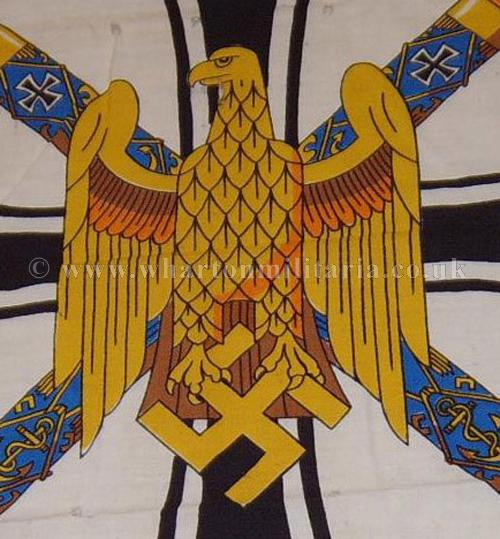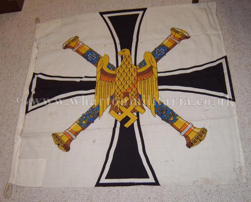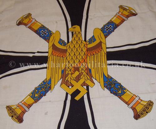A rare Kriegsmarine Grand Admirals Flag, approx 1 mtr square, showing the standard and crossed battons of the Grand Admiral's Office - also called the Donitz Standard. In lovely condition though there are some small holes, material parted a little along the seam but does not detract from this beautiful flag. Letter of provenance with this flag stating the Konteradmiral a.D. (Vice Admiral) of the Kriegsmarine, and Knights Cross holder, who previously owned this flag from the end of hostilities.
