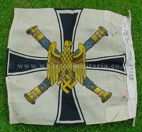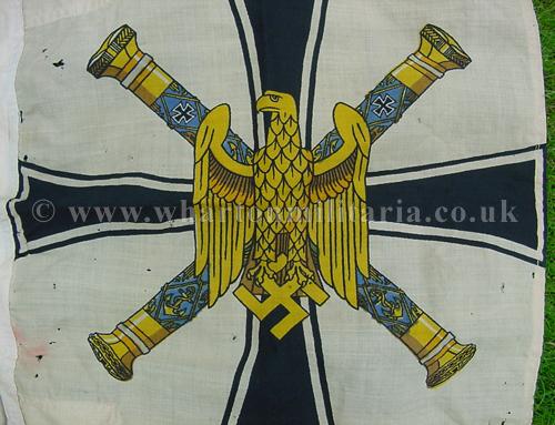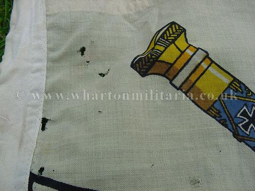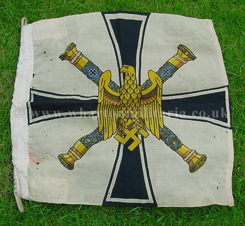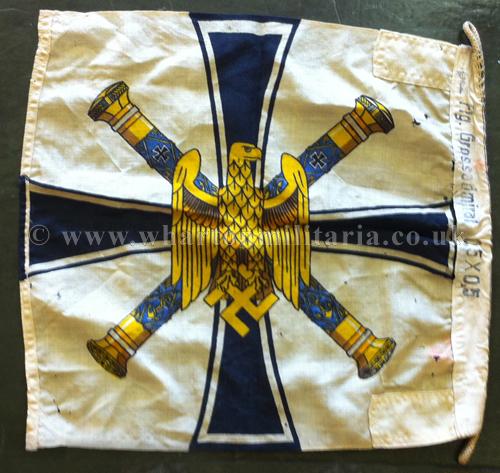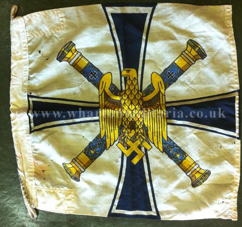 A rare Kriegsmarine Grand Admirals Flag, approx 0.5 mtr square, showing the standard and crossed battons of the Grand Admiral's Office - also called the Donitz Standard. In lovely condition though some small holes exist but do not detract from this beautiful flag, still rich in colour and very striking. This is the scarce and most sought after size of this iconic flag.