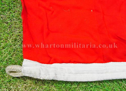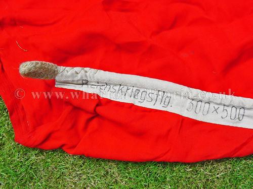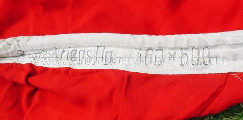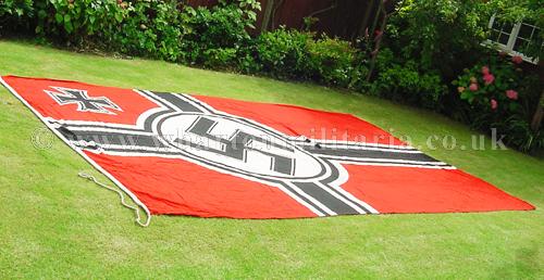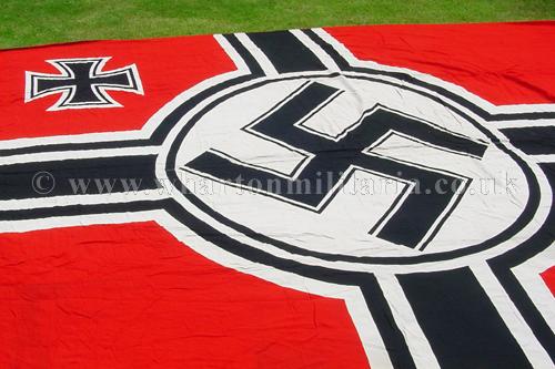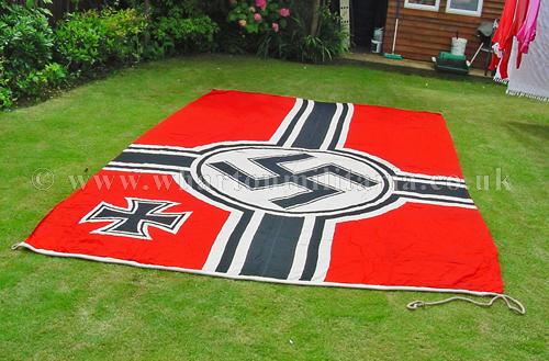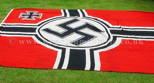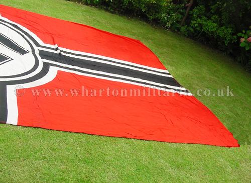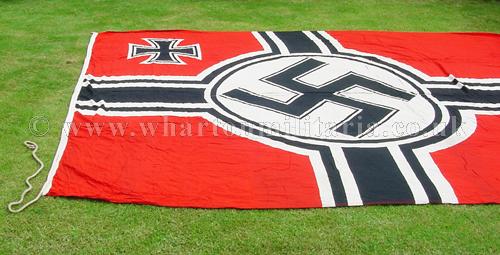 WW2 German Kriegsmarine battle flag, showing the swastika and iron cross insignia within the cross. Very large size 300 x 500 cm, typically used by the larger ships. Lovely condition flag without any damage or holes, nicely maker and size marked. This was a local veteran bring back, removed from stores at the end of the war, in mint unissued condition.