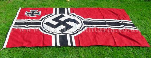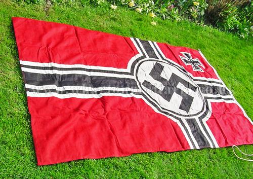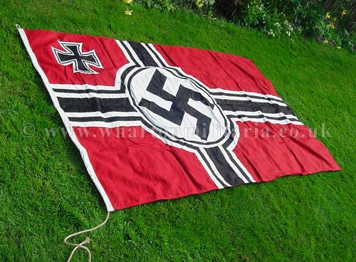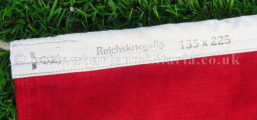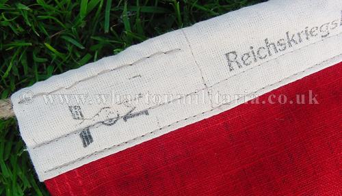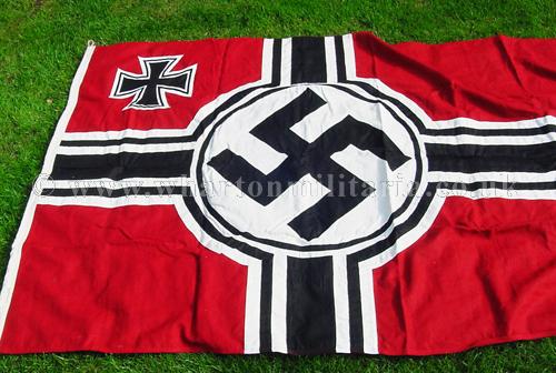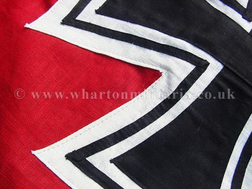 WW2 German Kriegsmarine flag, showing the swastika and the Iron Cross insignia, in excellent condition, early heavy quality linen multi-piece construction, large size approx 135 x 225 cm, KM eagle and maker marked along the edge band 'Bonner Fahnenfabrik, Bonn a. Rhein'.
