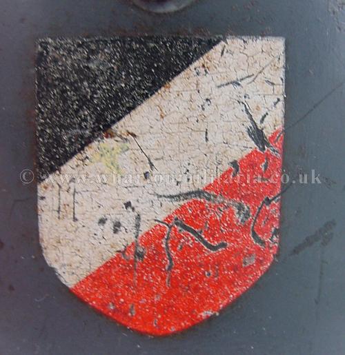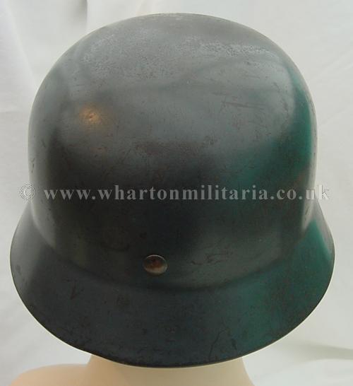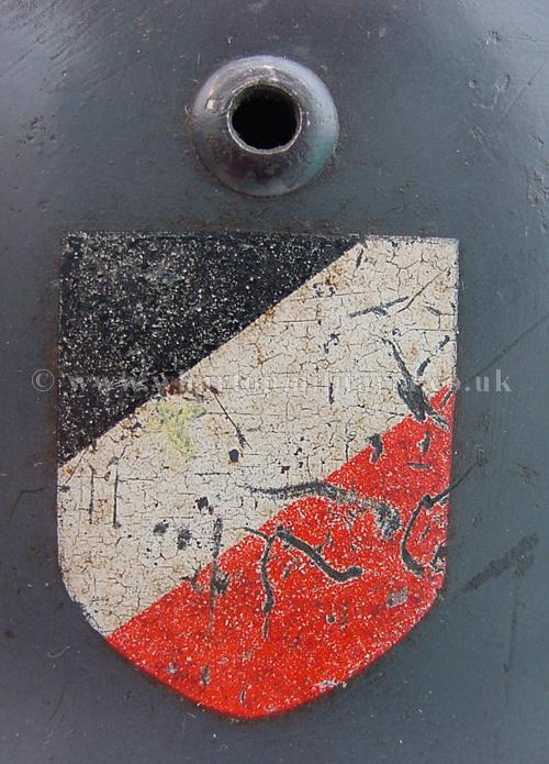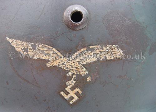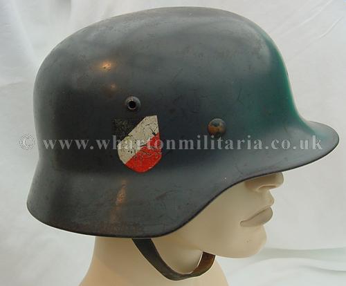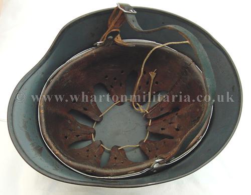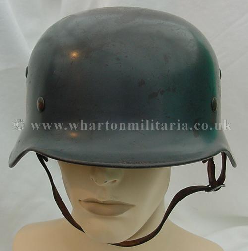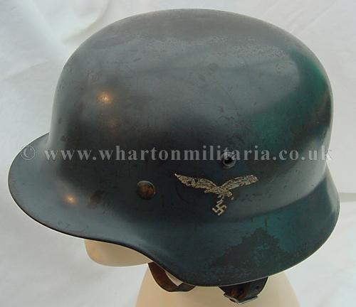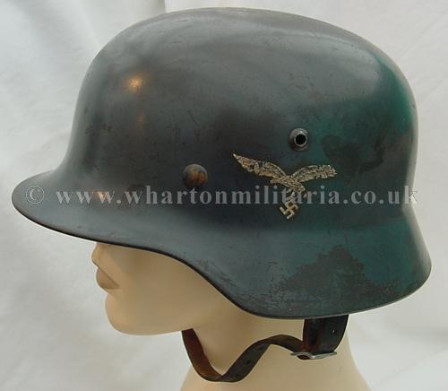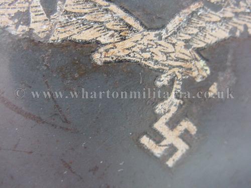M35 Luftwaffe double decal helmet in excellent condition, The helmet shell is in excellent shape, marked Q68 and batched 21441, still retaining its Luftwaffe grey paint with the odd scratch and mark, otherwise a uniform finish overall. The steel integrity has not been compromised at all, there are none of the usual bumps or dents. The Luftwaffe 2nd pattern eagle is in reasonable condition, approx 75% with some scratching and damage, national shield approx 85% intact, again with some scratching. The liner is in good condition with the leather supple. Liner is dated 1939 and sized 61. Complete with chin-strap. A very nice Luftwaffe helmet.