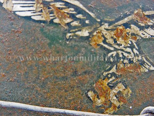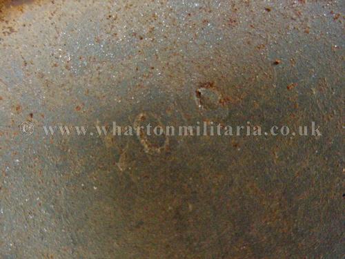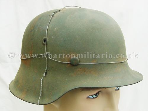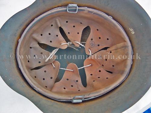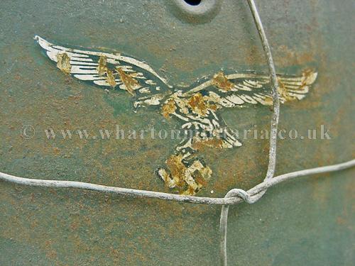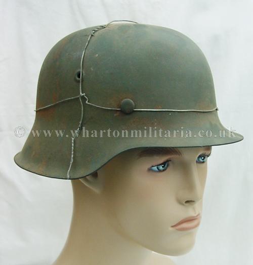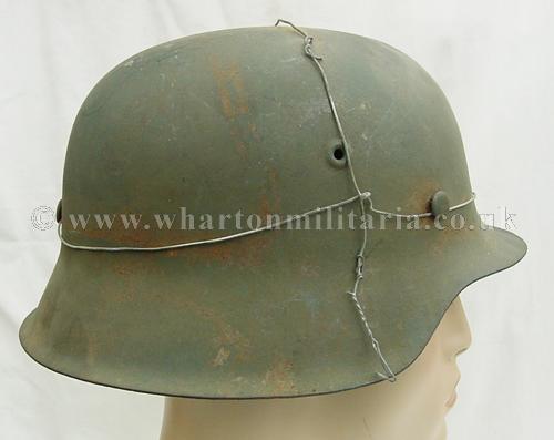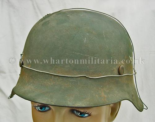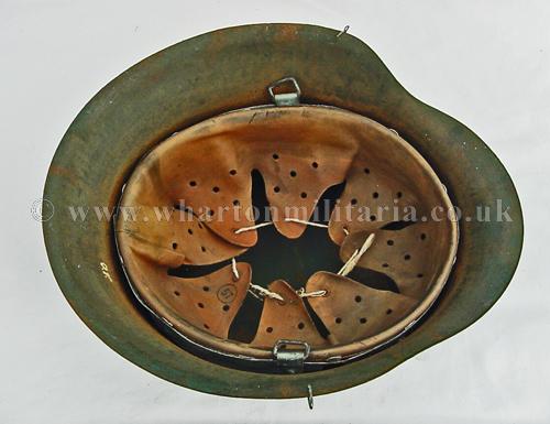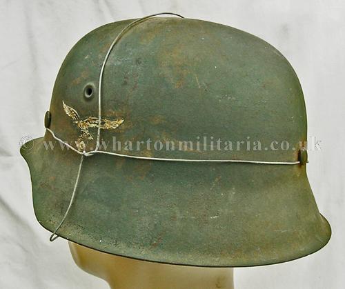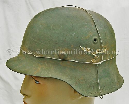 An M42 'raw edge' German single decal Luftwaffe helmet in very good condition. The helmet shell is in excellent shape, marked ET64 and batched 2019. The steel integrity has not been compromised at all, there are none of the usual bumps or dents. The helmet shell retains its paint finish across its surface, decal is approx. 60%, a dot above the right wing is visable as second pattern type, a single strand type wire is fitted around the helmet outer, there are two initials painted into the rim. The liner is in good condition with the leather being reasonable though stiff in parts, liner is dated but difficult to read and sized 57. A good used Luftwaffe helmet.