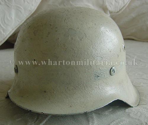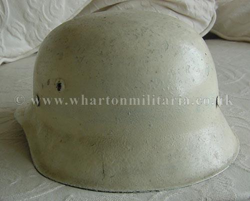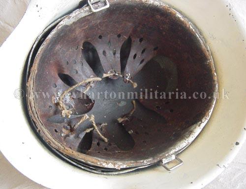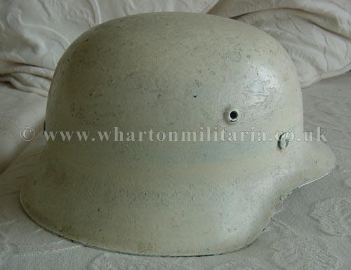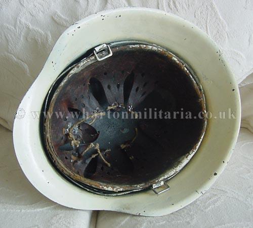 A fine example of an M42 'raw edge' winter camo German steel helmet in excellent condition, complete with its liner which is maker marked and dated 1940, size 59. The liner has seen a lot of use though is in good overall condition, the leather is basically supple however it has began to go a bit with time. The helmet shell is in excellent shape, marked hk06? and batched 3466. The steel integrity has not been compromised at all, there are none of the usual bumps or dents. The helmet shell retains its white brushed paint across its surface, faint painted rings/bands showing through under the white paint, some minor blemishes and stains though these do not detract at all. A nice example of a winter camo helmet.