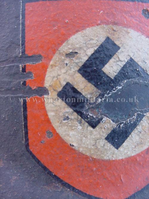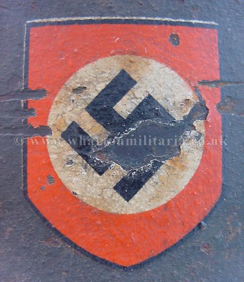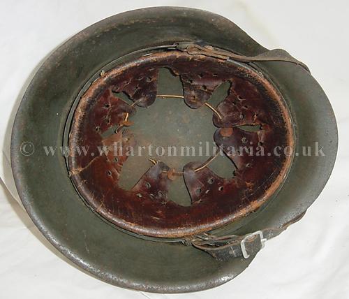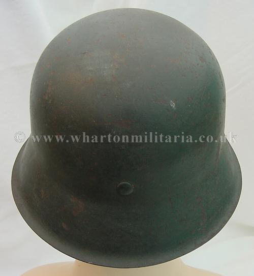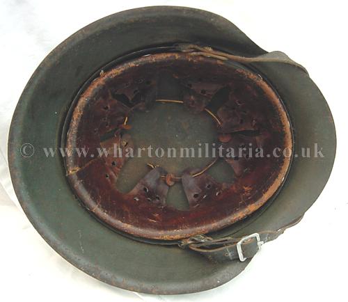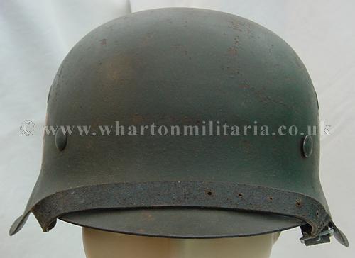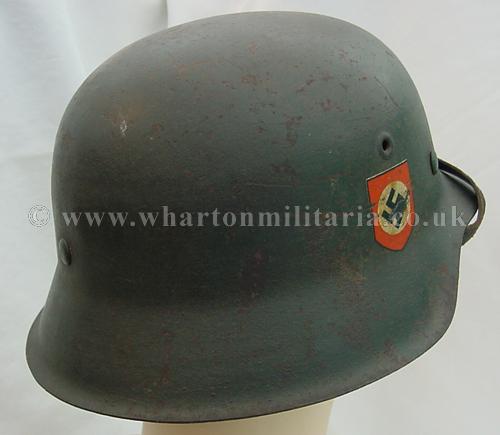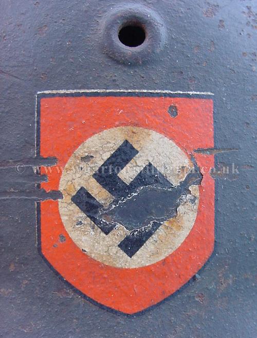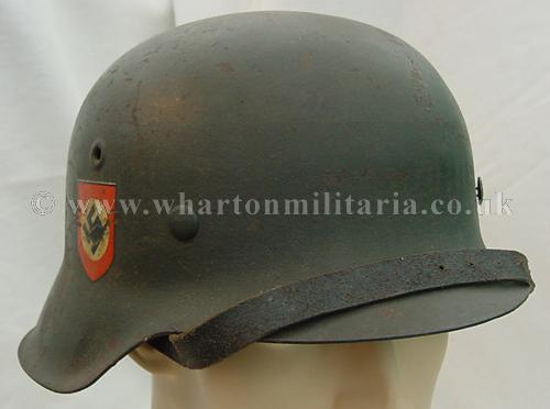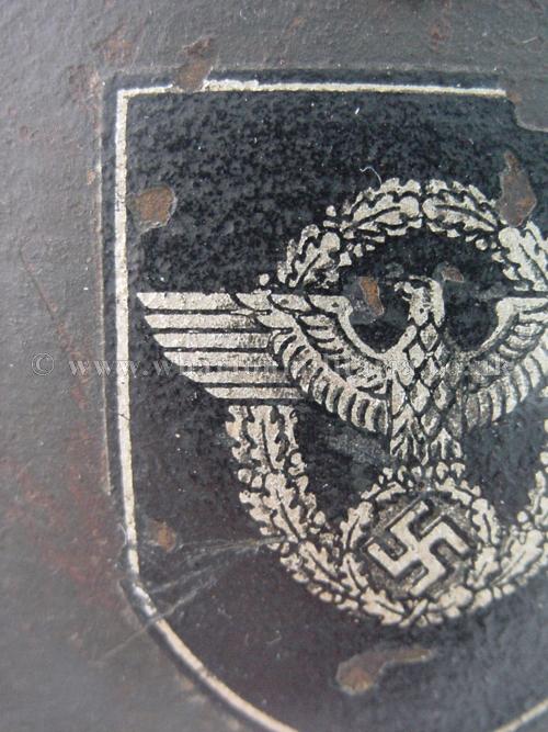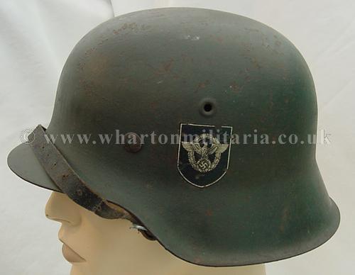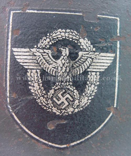M42 Police double decal helmet in excellent condition, The helmet shell is in excellent shape, marked ET62 and batched 2587, still retaining a uniform finish with the expected scratches and marks. The steel integrity has not been compromised at all, there are none of the usual bumps or dents. The police shield is in excellent clear condition with minimal scratching, party shield approx 75% intact, though has damage to the centre area on the swastika and a number of scratches to the left side of the decal. The liner is in 'lived in' condition, the leather is basically supple however it has began to go a bit with time and has had some leather waxing applied at some point. Liner dated 1940 and sized 57. Complete with chin-strap. A nice police combat helmet.