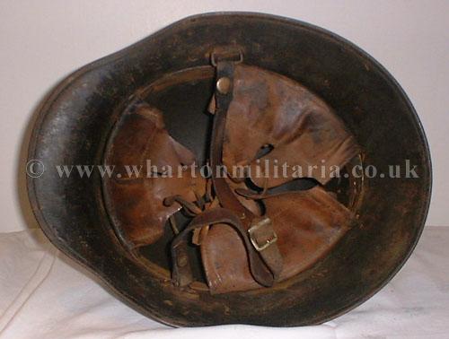 WW1 M17 Austrian shell, M17 liner, complete with chin strap, Luftschutze decal to front (50% decal remaining) dark green painted though blotches of white paint are evident.