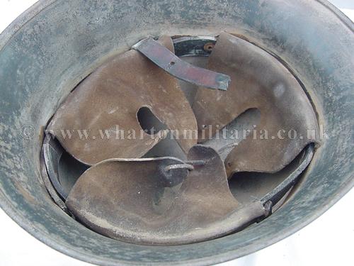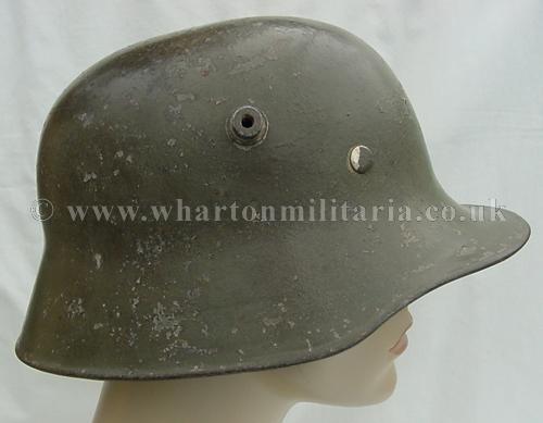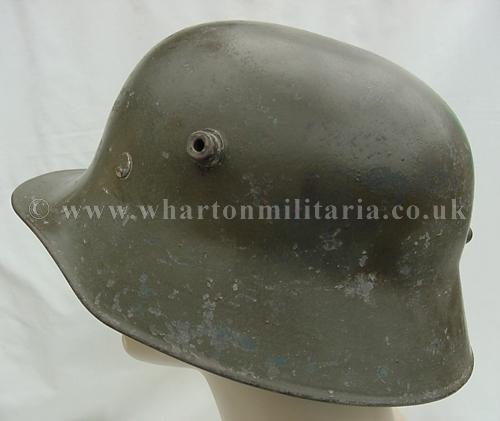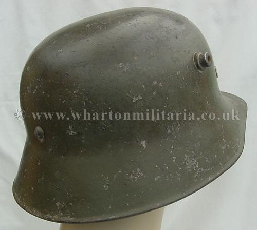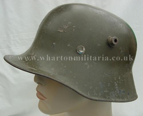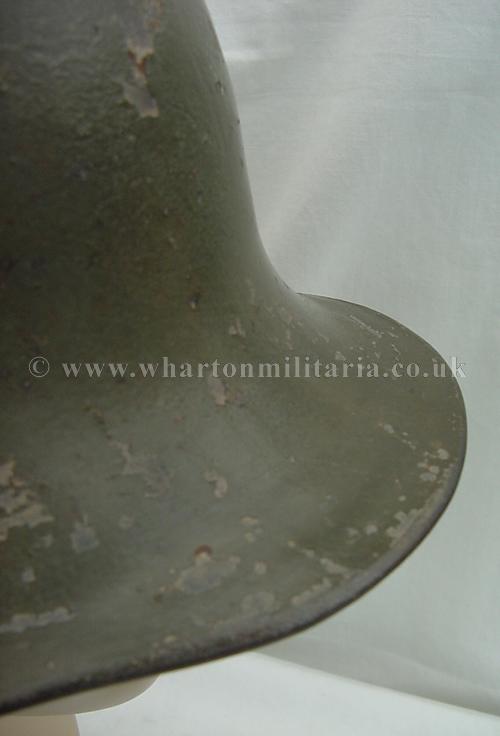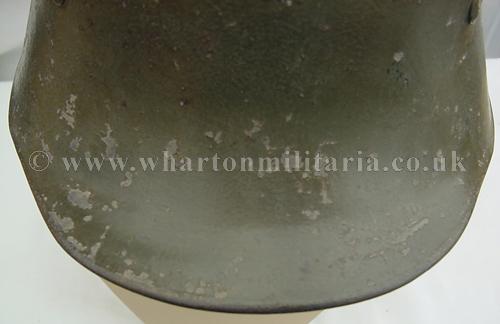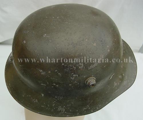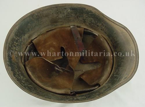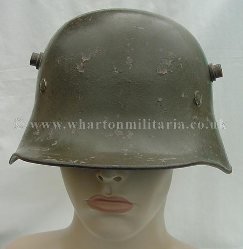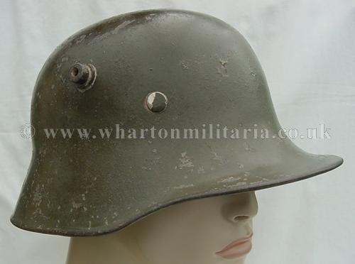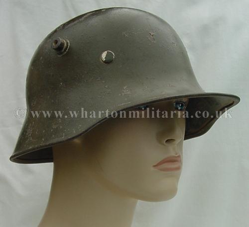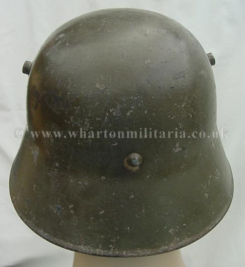 WW1 M18, M18 liner, dark green painted finish, a text book example of this helmet, in excellent condition without the usual crack on the front rim which in itself is a scarce bonus. Liner is in very good condition with all pads sound, remains of chin strap still attached. A well presented WW1 German M18 helmet.