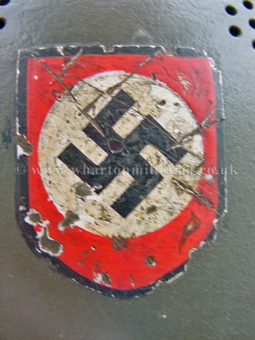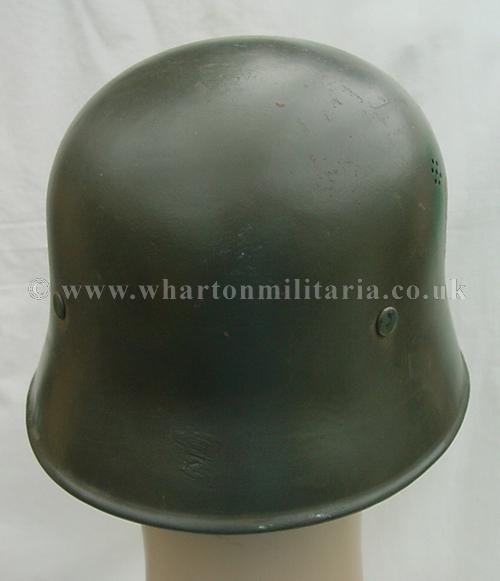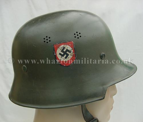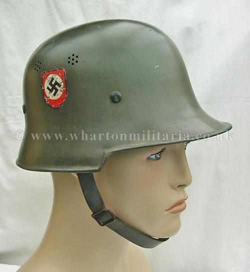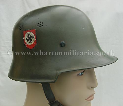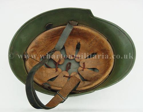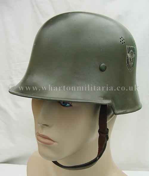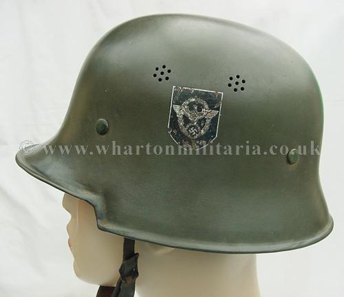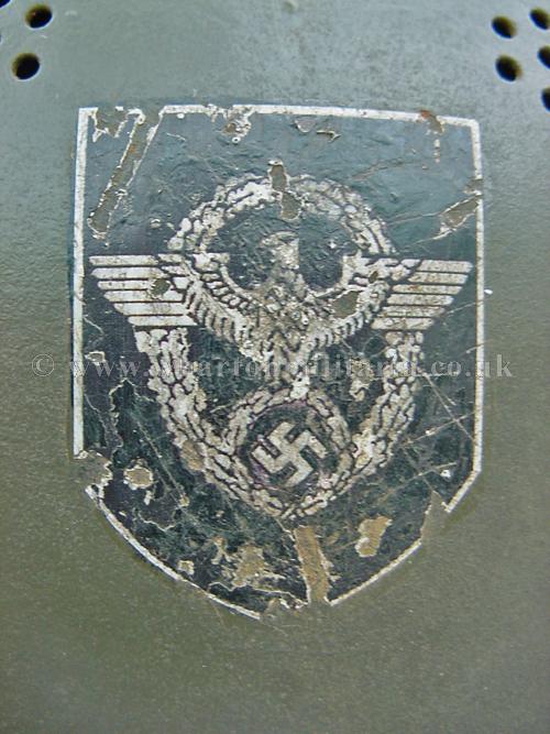 Double decal Police helmet in green finish, political style (double air vents), police decal about 85%, usual scratches, party shield similar. Liner and chin strap in excellent condition. Liner size 56, maker marked. A really nice example of this increasingly difficult to find helmet.