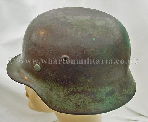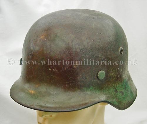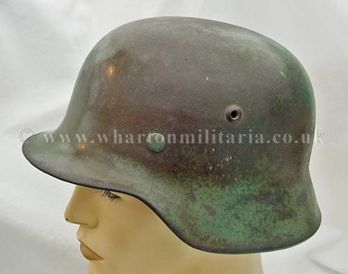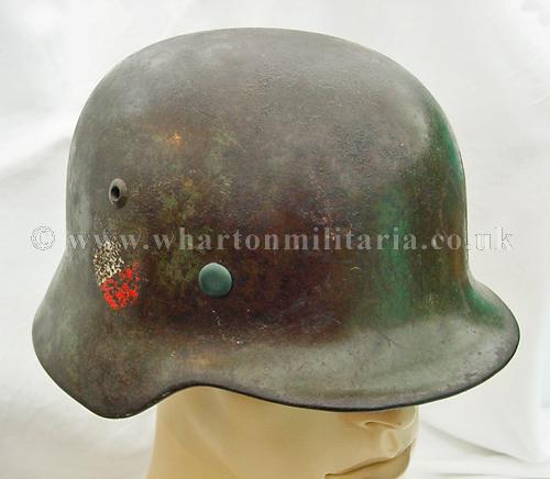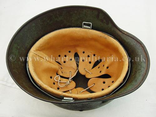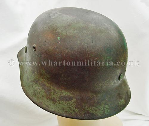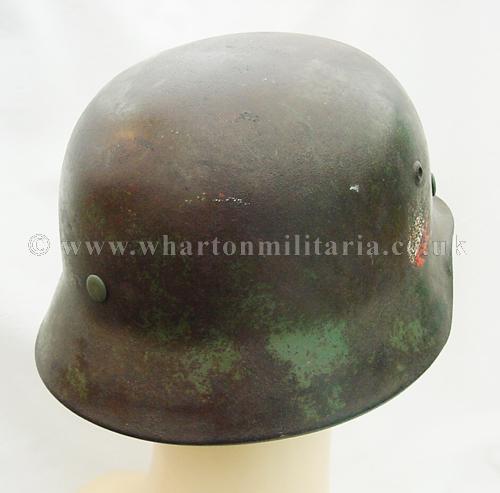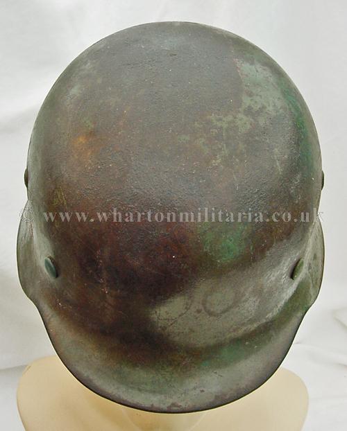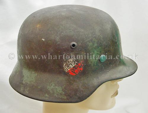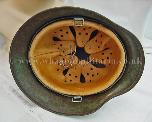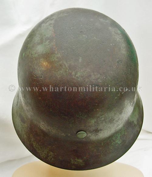 M35 helmet in excellent condition, The helmet shell is in excellent shape, marked ET64 and batched 4667, still retaining a very nice army paint finish with a uniform patina overall. The steel integrity has not been compromised at all, there are none of the usual bumps or dents. There remains a national shield decal in reasonable condition, approx 65%, some flecks of the army shield remain but minimal. The liner is in good condition with the leather supple. Liner is dated but difficult to read and sized 57. The helmet liner studs appear to have been repainted - I believe they have been replacements as the colour is lighter than the patina of the helmet though they match the remaining paint finish. A nice M35 helmet with the bonus of the surviving national shield decal.