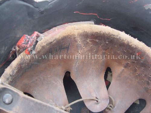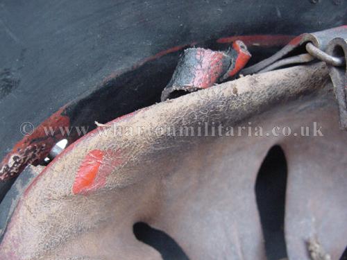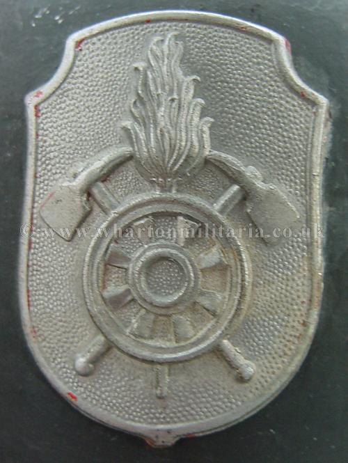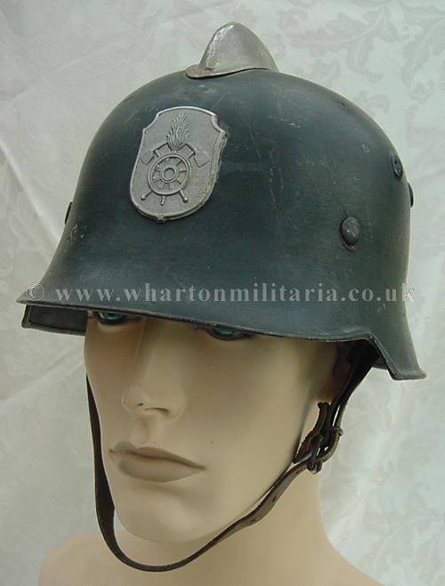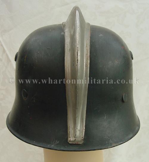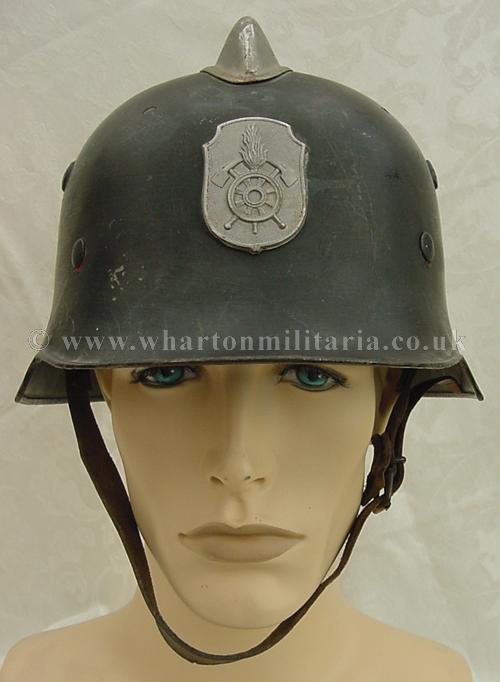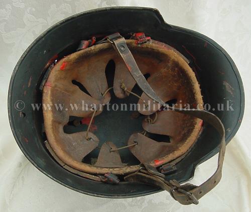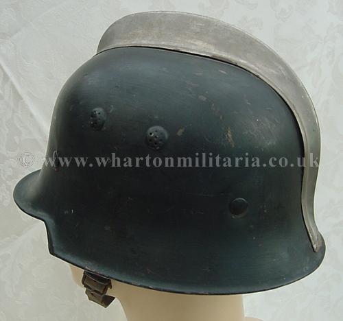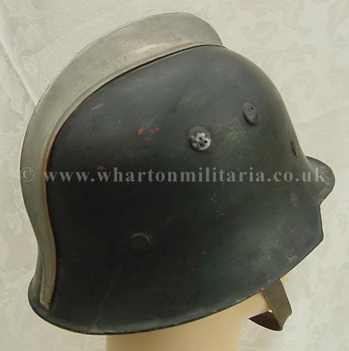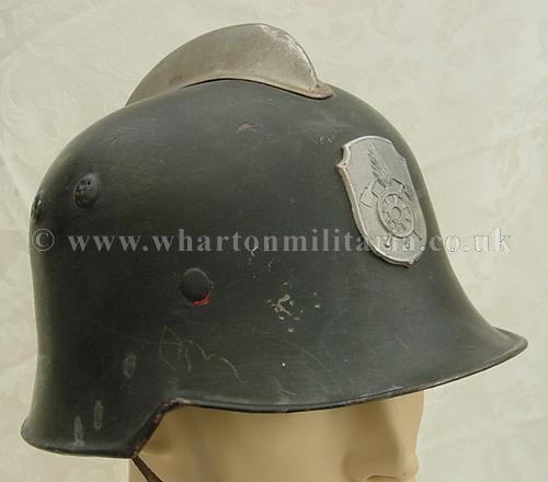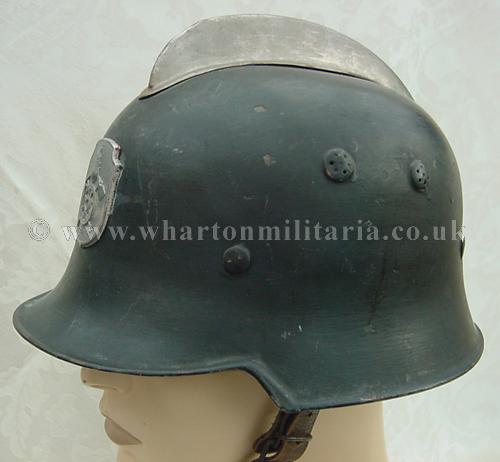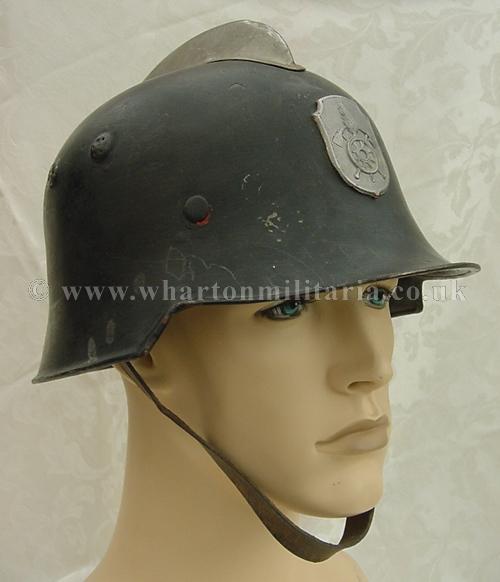 Fireman's helmet, standard political style (double air vents), helmet painted black in colour, though red paint visible underneath around rivit holes. Helmet has correct white metal comb and shield plate fitted to the front. Liner in fine condition though some red paint marks on the leather. Chin strap complete and in good condition. A nice fireman's helmet.