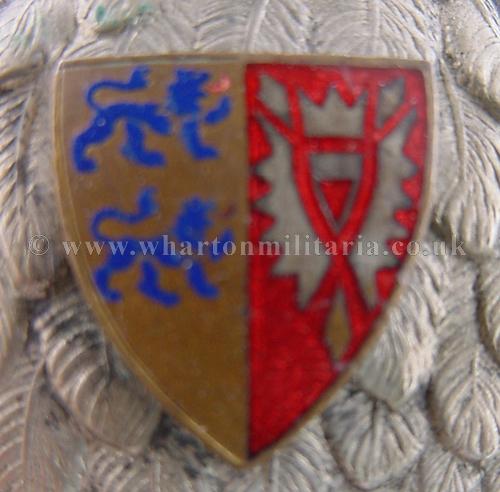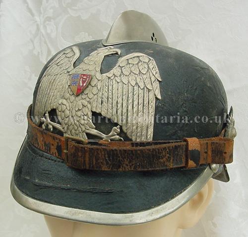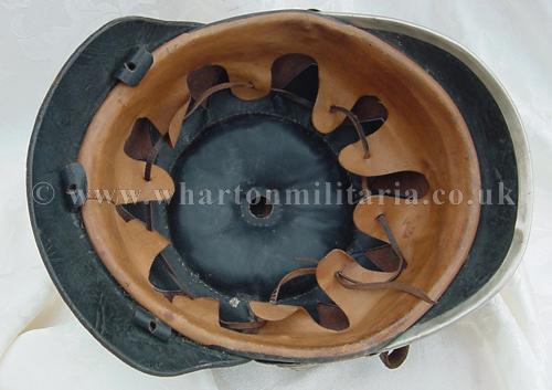 A fine original Imperial German Pickelhaube Fireman's helmet with liner, chin strap and helmet plate. The helmet has it's original black leather visor and neck protecter. The visor has a metal rim edge. Ornate brass bosses backing white ringed cockades retain the original leather chinstrap with buckle. The top of the helmet has a large chromed combe. The front of the helmet has a white metal eagle plate with a coat of arms to the chest, secured by the usual brass fittings on the inside of the helmet. The interior of the helmet has it's original cushioned leather sweatband liner which is clean and undamaged, the liner is ink stamped '57'. A really nice looking civil pickelhaube.