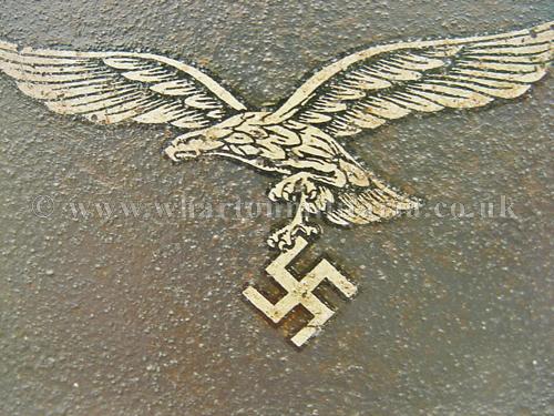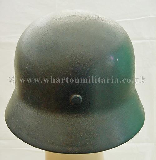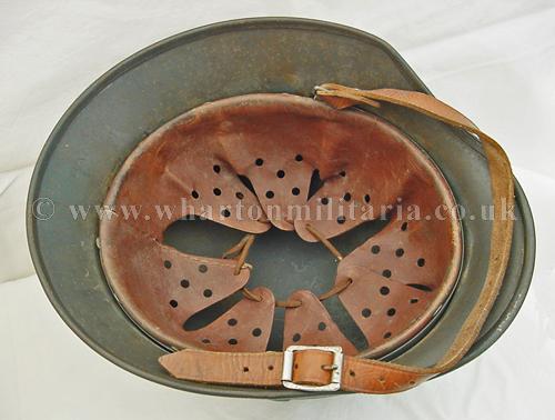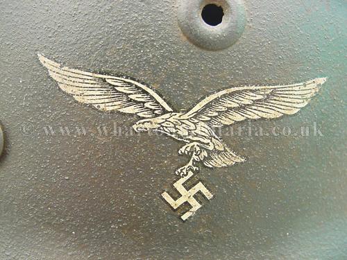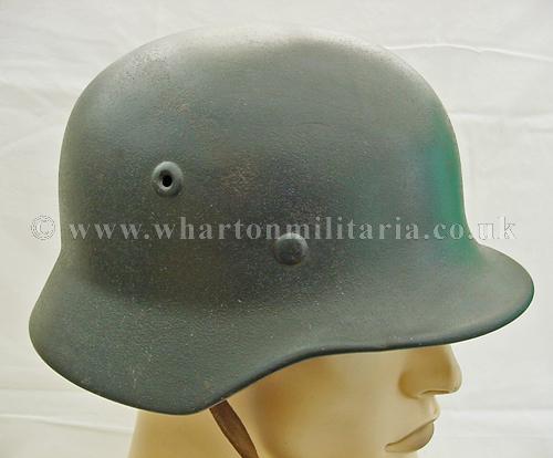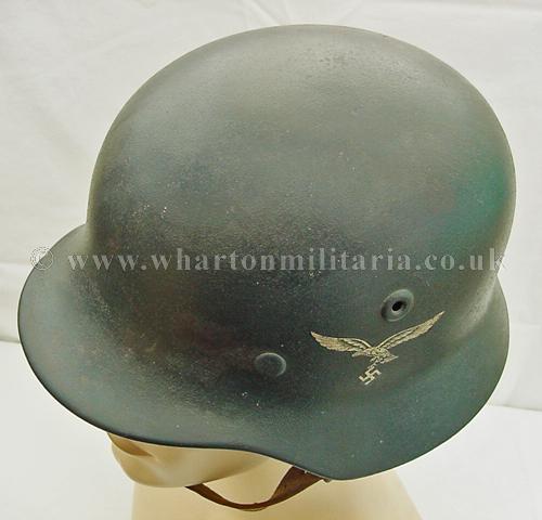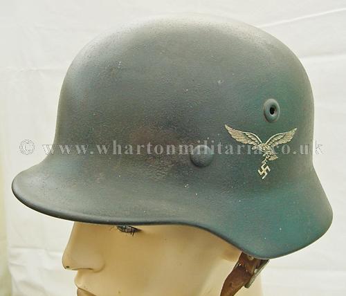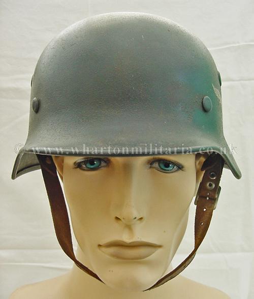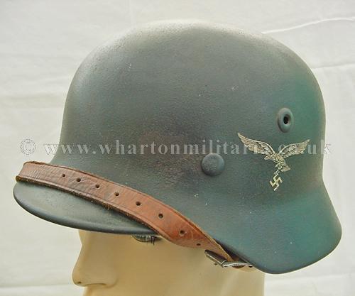 M40 Luftwaffe single decal helmet in excellent condition, The helmet shell is in excellent shape, marked Q68 and batched DN211, still retaining its Luftwaffe grey paint with the odd scratch and mark, otherwise a uniform finish overall. The steel integrity has not been compromised at all, there are none of the usual bumps or dents. The Luftwaffe 2nd pattern eagle is in excellent condition, approx 95% plus. The liner is in good condition with the leather supple. Liner is dated and sized. Complete with chin-strap. A very nice Luftwaffe helmet.