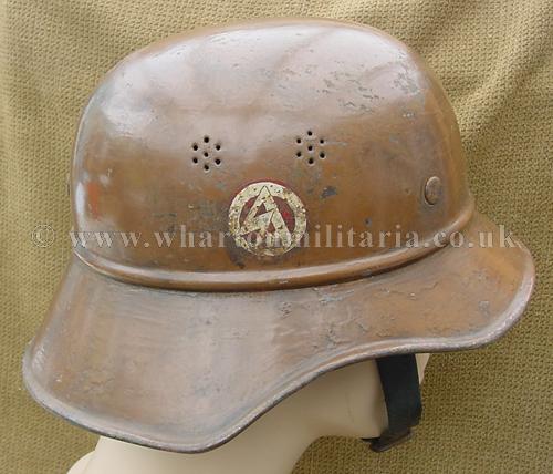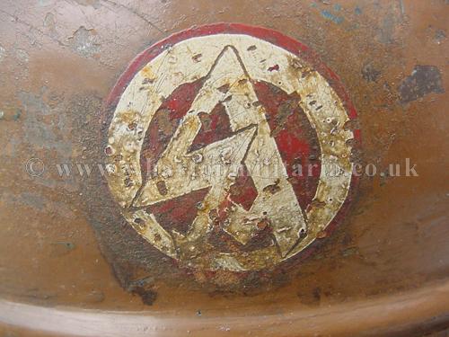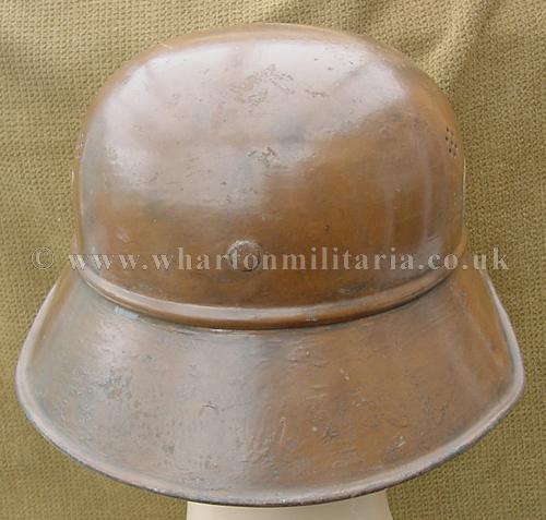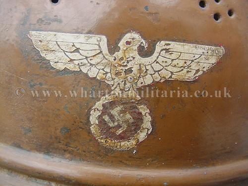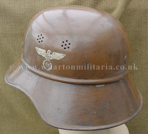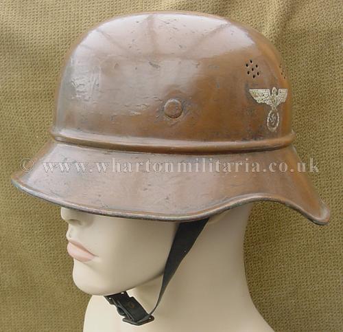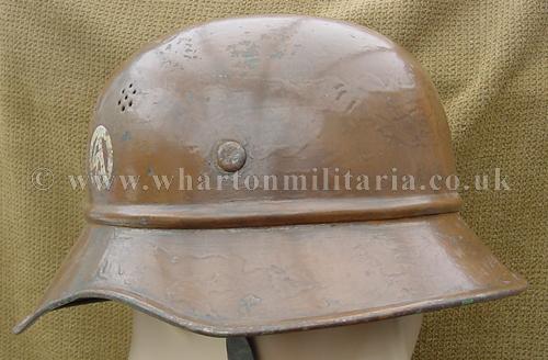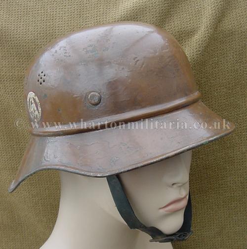 3 piece Luftschutz helmet, with painted SA roundle and eagle to the sides, brown painted, helmet rim details are painted over, remains of a label to rear rim, liner has some edge scuffing, chin strap in good order though has some colouration to the fixing area, good condition throughout, interesting example of an early used Luftshutz helmet.