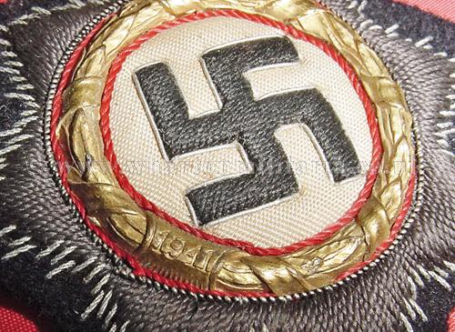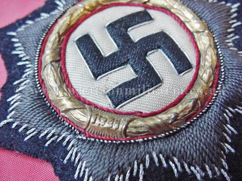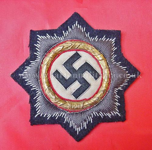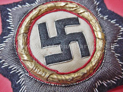 A German Cross in Gold, cloth version on black backing, for Panzer and SS issue, excellent condition.