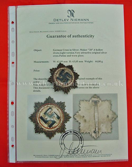 A now scarce German Cross in silver, 4 rivet light weight example by Zimmerman, maker marked ‘20’ under the pin, in excellent condition. The cross has been worn though there is no enamel damage. An extremely nice example of this senior award with a lovely feel overall.
