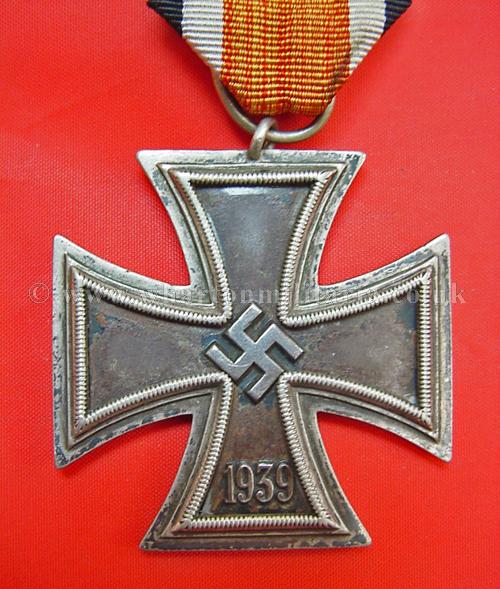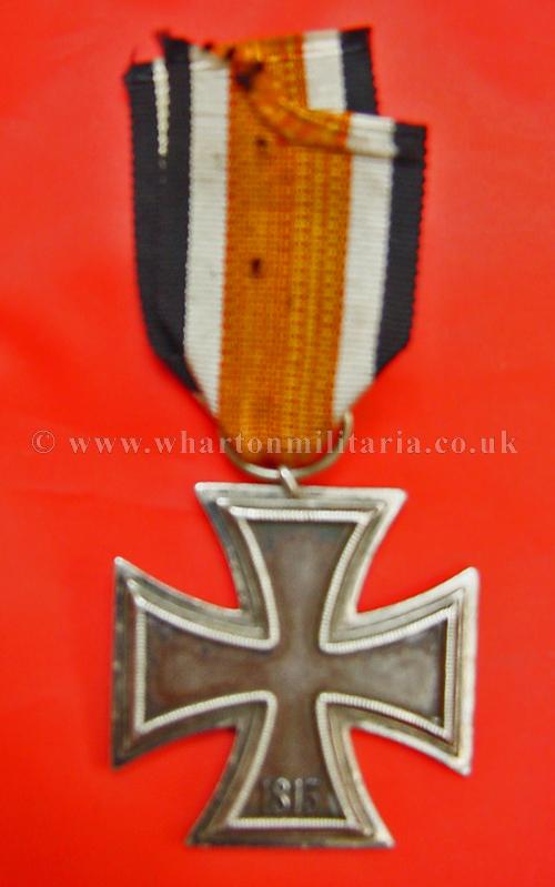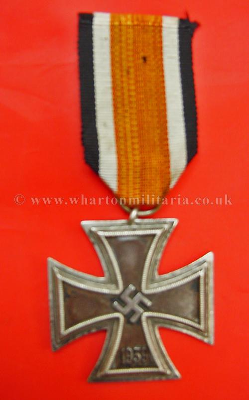 1939 Iron Cross 2nd Class, darkened patina, iron core in lovely crisp condition retaining most of its black finish, swastika is a raised example, ring marked '98' for Rudolf Souval of Vienna, frame ring on the back has lifted slightly, most likely contemporary as has even frame patina, ribbon a little faded, lovely example of a WW2 Iron Cross 2nd Class.