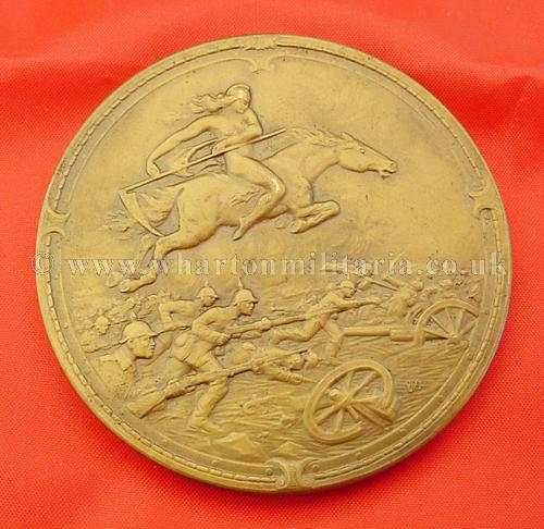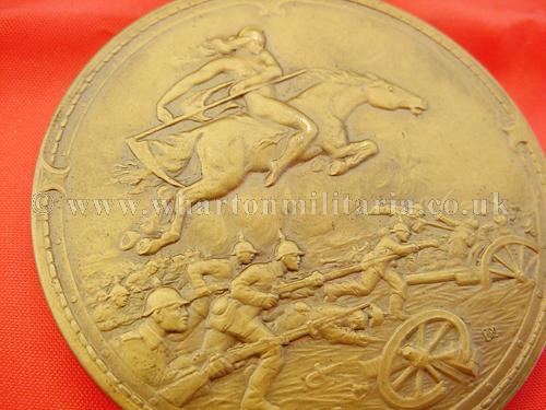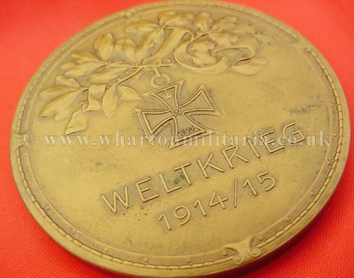 WW1 German Patriotic 1914-15 medal, approx size 60mm diameter, heavy bronze like metal, front face has image of the 1914 Iron Cross hanging from both laurel and oak leaves, under which is ‘Weltkrieg 1914/15’ whilst the reverse shows a dramatic battle scene of infantry charging the enemy lines, who look to be perhaps French from the helmet shapes, with a naked spear thrusting woman riding a horse above the battle. These very patriotic medals were produced in the early parts of WW1 to celebrate a serviceman’s time in the war. Patriotic medals are not easy to find and are in themselves works of art, battle scene has the artists initials 'BM'.