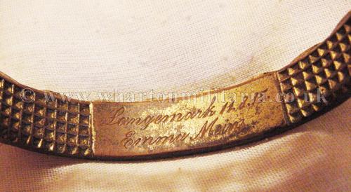 A now scarce WW1 German commercially made patriotic bracelet made from grenade shell band, has attached enamel 1914 Iron Cross with laurel and oakleave sprigs, very nice gilding, fine workmanship, engraved details inside with date 11th August 1915, very typical of the quality of the period. Bracelet opens as a bangle, internal dia. approx 60mm wide and 54mm internal height. Very nice patriotic item.