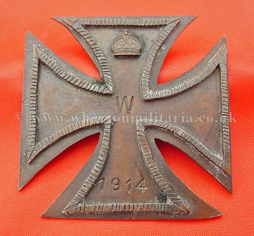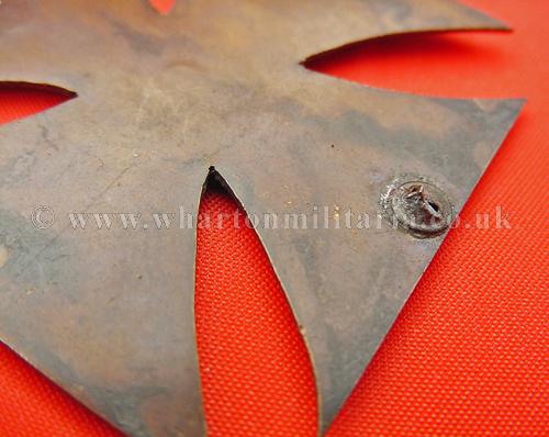 An interesting 'trench-art' WW1 1914 Iron Cross 1st Class, measuring 45 x 45mm, it looks to be made of copper shaped to match the Iron Cross 1st class. The front follows the design of the Iron Cross with the ‘silver’ frame outlining the cross shape, it has a stamped ‘W’ in the centre of the cross and similarly ‘1914’ in the bottom cross arm, in the top arm is the ‘Imperial’ crown though this is made from a Kings Crown off a British cap badge. The rear of the cross once had a pin fixed to the back and possibly a hook too, there appears to be a metal spur in the hook position. This is a fascinating item that looks to have been something crafted during the war as either a piece of trench art to while away time or perhaps something of a mockery to tease the German Soldiers. Equally, it may have been a German field made item, my gut feel is its British made mainly due to the British army crown. A little something different that has been carefully made. Nice patina and overall quality.
