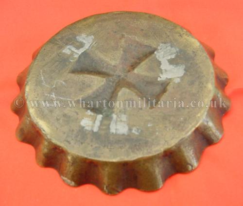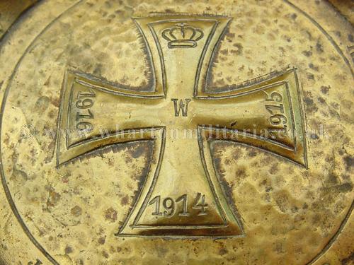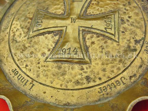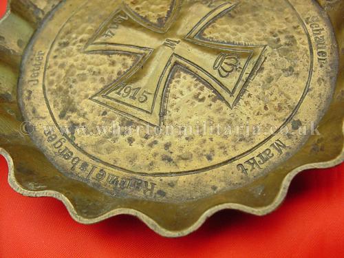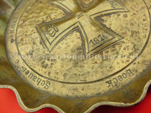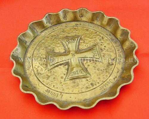 WW1 Patriotic Iron Cross ash tray 1914-1916, a nicely drop forge stamped brass ashtray showing the 1914 Imperial Iron Cross with the dates ‘1915’ and ‘1916’ on the other arms. There are other names going around the inner edge of the tray, approx. 115mm diameter. Ash tray is quite heavy, about 2mm thick overall, another fine and interesting WW1 patriotic piece.