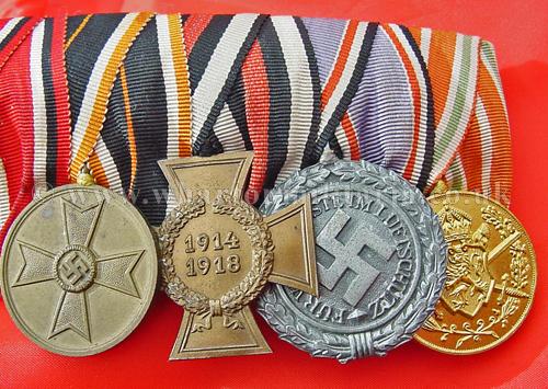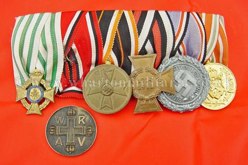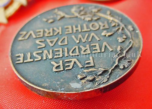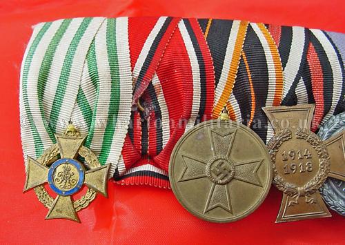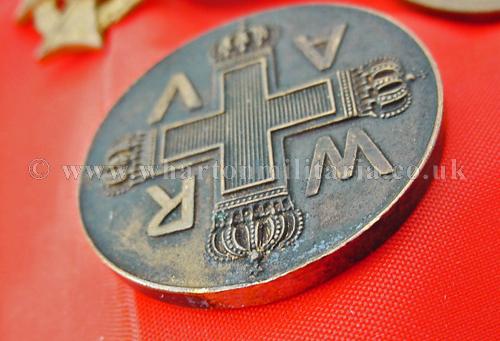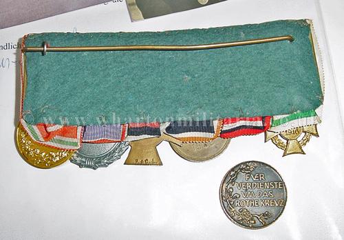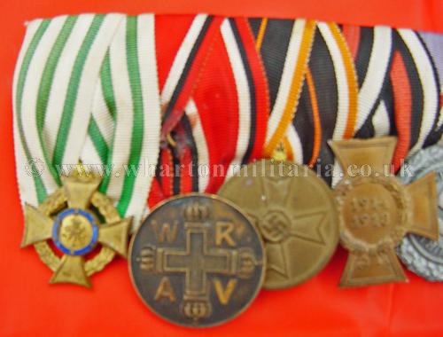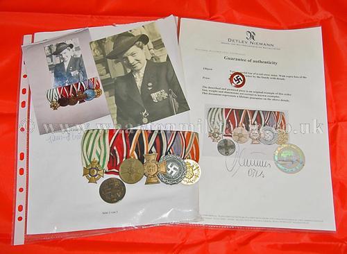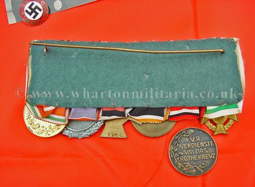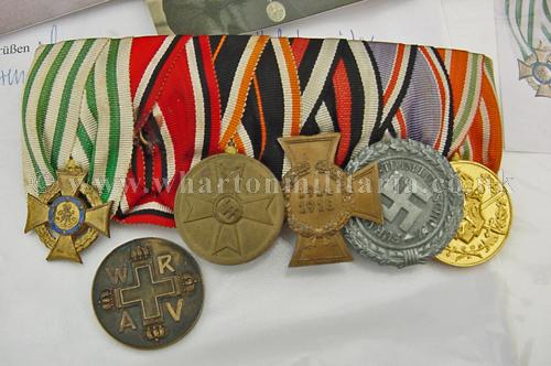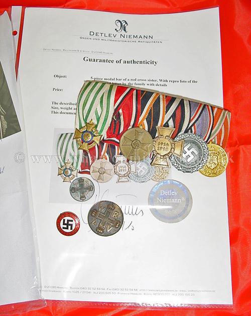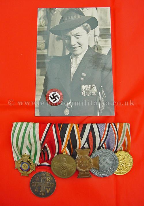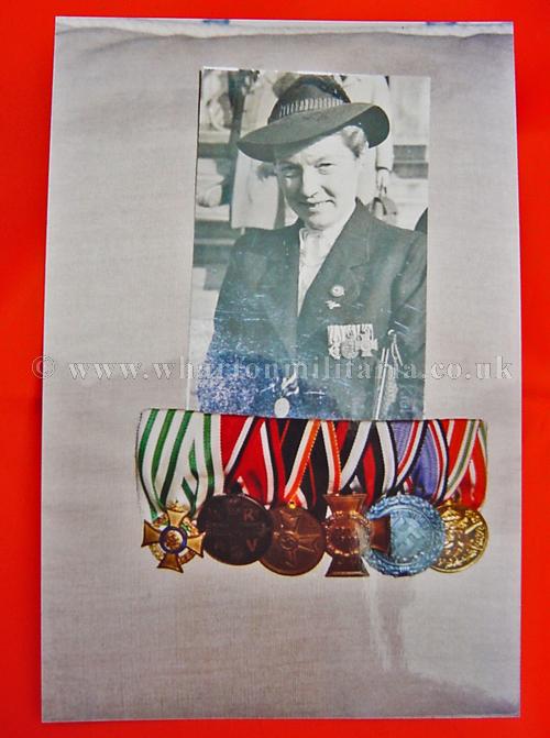 An extremely scarce attributable medal bar group of 6 to a German Red Cross Sister who served in WW1 during 1916-18 in Biala, Russia, France and Laon followed by inter war and WW2 service. Group includes the Federal Military Cross for WW1, the Red Cross Medal, the Honour Cross for non-combatants and a 1915-18 State issue War Service Medal, along with the War Merit Medal and Luftschutz Medal for WW2. The WW1 Red Cross Medal has come away from the medal bar, its ring has come away from the medal itself and is retained within the ribbons. Group includes a postwar photograph of the woman, her NSDAP membership badge and a signed letter from her son passing the medal group to one of the main German medal dealers and a further Niemann lifetime guarantee. This medal group has not been on the open market before and represents a rare opportunity to aquire a scarce Red Cross nursing group covering both WW1 and WW2.