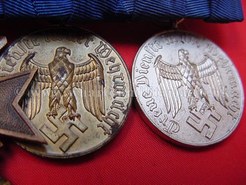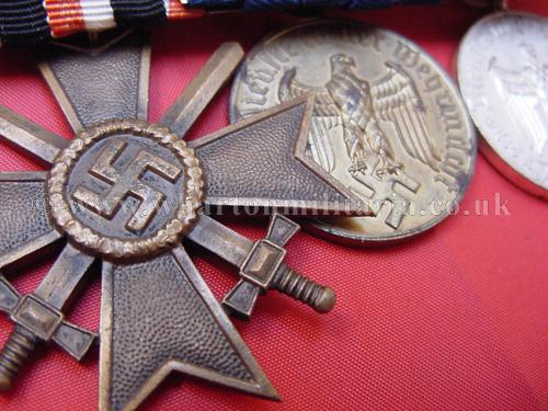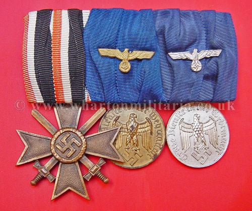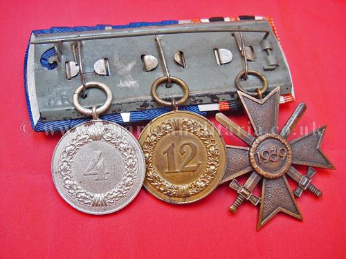 Medal Bar of 3 - War Merit Cross with Swords and 4 and 12 year Long Service Medals complete with their correct ribbon eagles - court mounted