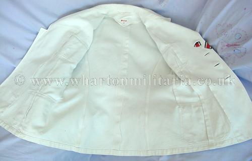 WW2 German Kriegsmarine Officer's summer white tunic, in excellent condition. A fine tunic, inside marked with owners details in the usual KM way, two pocket loops for awards, gilt alloy breast eagle and shoulder boards. Tunic sizes approx 38cm across the shoulders, 73cms drop from neck to hem and arm length from shoulder to cuff is 61cms. A nice Kriegsmarine tunic. Awards not included.