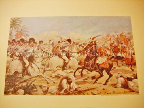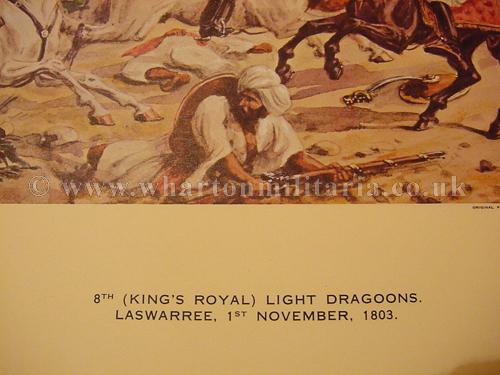 A scarce limited print run of the 8th (King's Royal) Light Dragoons at Laswarree on 1st November 1803. This is a limited print of the series of the Regiments at war, printed by Her Majesty's Printers in 1974, the original being painted by R Simkin. Beautifully executed, size approx 19 x 14.5 inches, would look stunning mounted. The print is old but unused so as new condition.