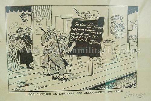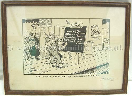 A rare and sought after signed wartime Strube cartoon print, absolutely lovely and in excellent condition. Cartoon is entitled 'For Further Alterations See Alexander's Time-Table' ~ the cartoon shows a railway station with its 'time-table' being amended by British and American soldiers whilst German soldiers look on in frustration from another platform ~ influnced by the Italian campaign. As always with Strube cartoons there is so much to see in the artwork. A little about Strube ~ Sidney 'George' Strube 1891-1956, a notable member of the London Sketch Club in the thirties, Strube was the Daily Express’s editorial cartoonist from 1912 to 1948. For many of those years, the paper had the largest circulation in the world, and Strube became the most popular cartoonist of the inter-war period. He especially ridiculed the Nazi regime and its personalities which found the Daily Express being a banned publication in thirties Germany, and himself on the Nazi hit-list during WW2. A really nice item to compliment any collection, simply scarce as well as an investment opportunity.