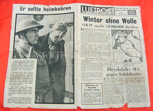 A lovely surving and quite rare WW2 British propoganda leaflet 'LUFTPOST' (airpost) dropped by the RAF on to the German troops, dated 7th October 1941. Leaflet is approx 8 x 5 in, is A4 folded to give 4 readable sides, full of 'news' that the German troops 'needed' to know plus a cartoon with 2 political officers etc. These documents are rarely found these days as most simply never survived the war. Rare collectable item for both the RAF or German collector. This is a rare find for the descerning collector.
