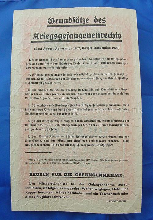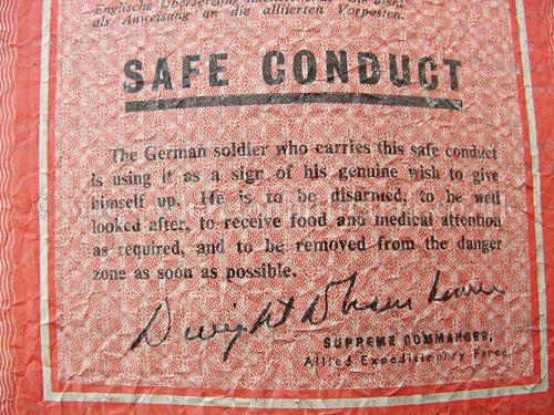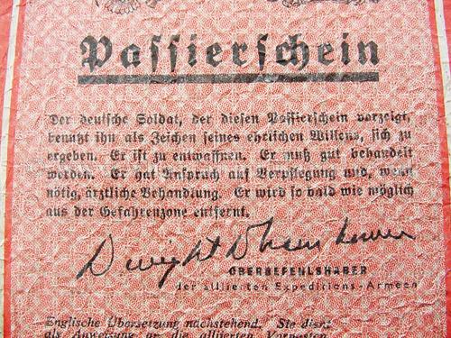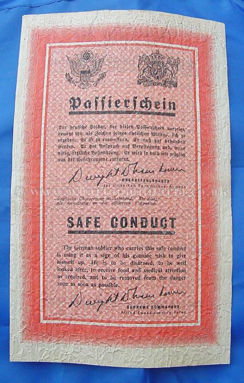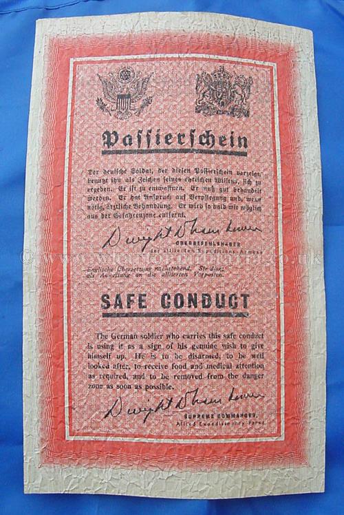 An extremely rare WW2 Allied printed "Passierschien" Safe Conduct Pass leaflet, printed in both English and German, these were dropped over Germany by the Allies to encourage the German forces to surrender. The German Serviceman bearer of the Safe Conduct Pass would allowed to surrender without fear of harm. This leaflet, printed code ‘ZG61’ was dropped from September 1944 to March 1945. The leaflet bears the printed name and signature of General Dwight D. Eisenhower, Supreme Commander, Allied Expeditionary Force. These are increasingly difficult to find these days.