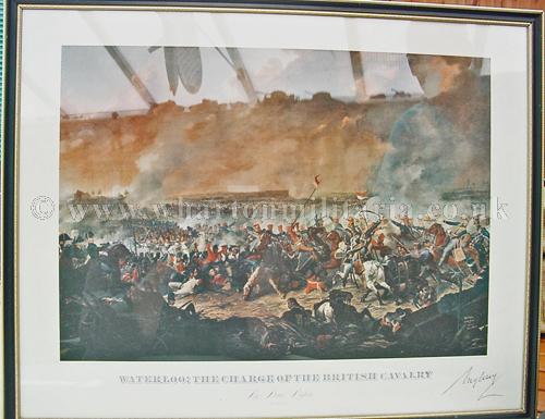 A fully framed and well presented military print of 'Waterloo: The Charge of the British Cavalry' by Denis Dighton, signed by 7th Marquess of Anglesey. This is a limited edition print especially with the late Marquess's signature, the original art work is within the National Trust Collection and can be seen at Plas Newydd, Angelesey. The print is in beautiful condition, published 1976 by The Wellington Collection, National Army Museum, London, 1976 and personally signed in graphite by the Marquess of Angelesey, a scarce and collectable print.