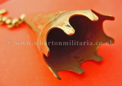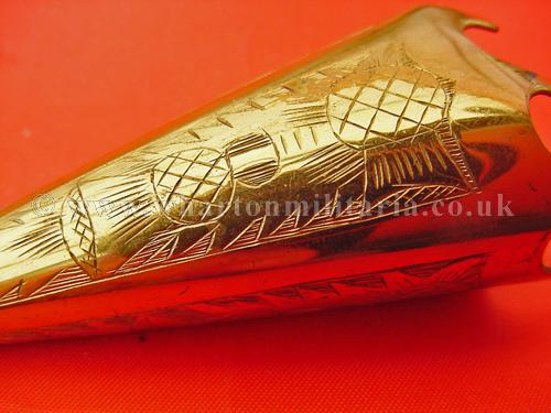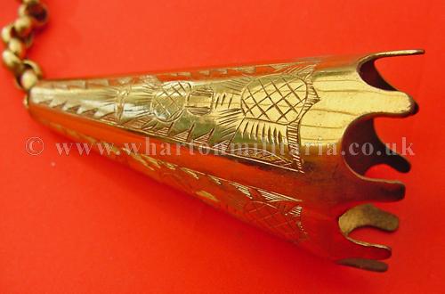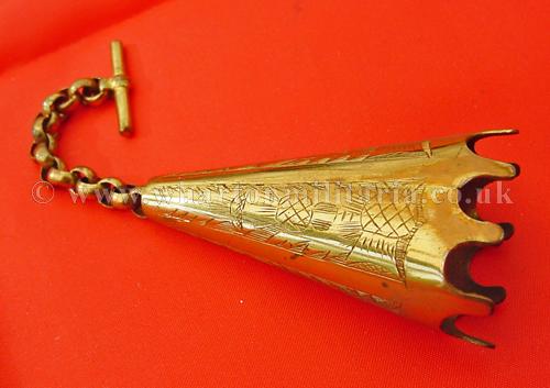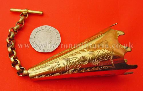 A scarce Scottish Volunteers aiguillette shoulder chape to a Gordon Highlanders Volunteer Officer in unused condition, the aiguillette cords are clasped by the chape to hold the cords with the chain and clip to attach into the button hole, finely made, thistle design, retaining all gilt, chape size approx 2 1/2 inches. A very nice and quite scarce item.