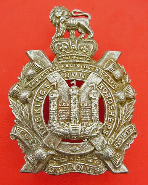 Other ranks Victorian helmet plate centre or glengarry badge to the Kings Own Borderers, with three loops to the reverse, Edinburgh Castle to the centre of a Scottish cross on circlet bearing the title, thistle backing with lion on crown.